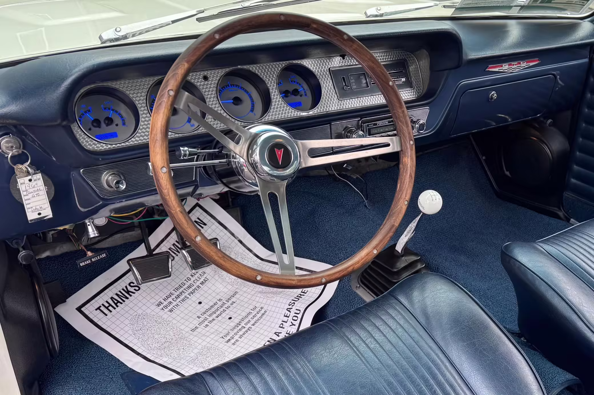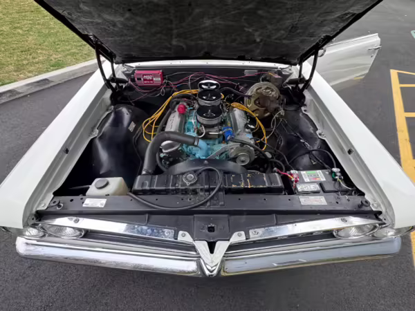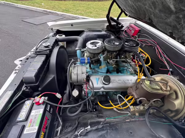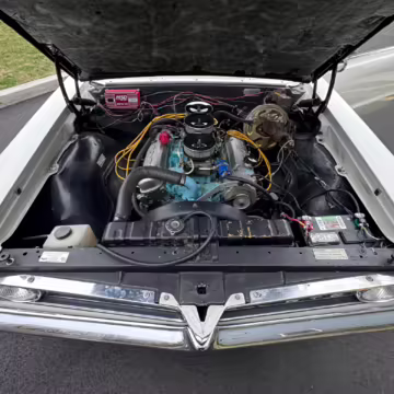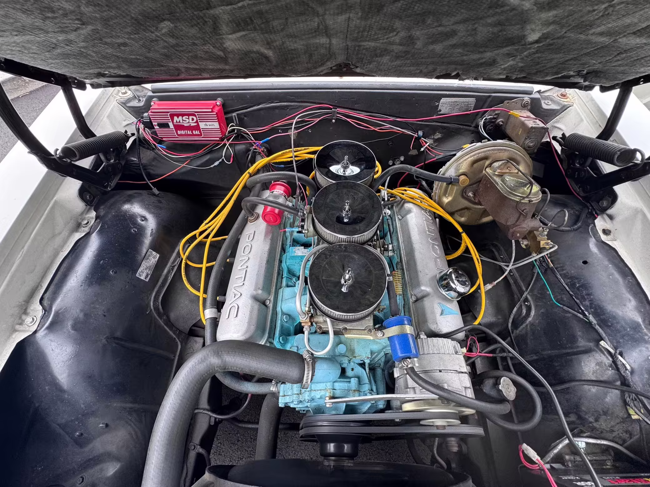 • Power comes from a 389-cubic-inch Tri-Power V8, rated at about 330 horsepower and 430 lb-ft of torque. Output is sent to the rear wheels via a 5-speed manual transmission.