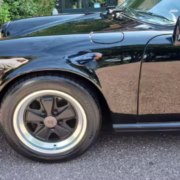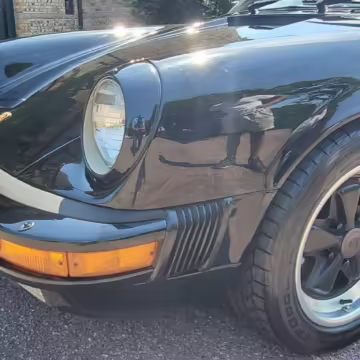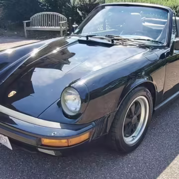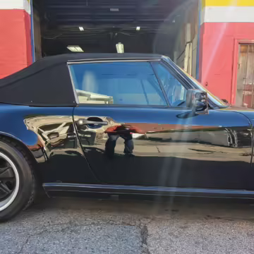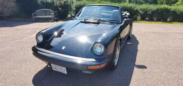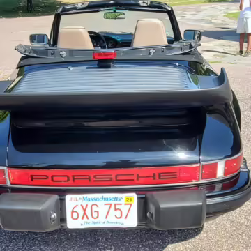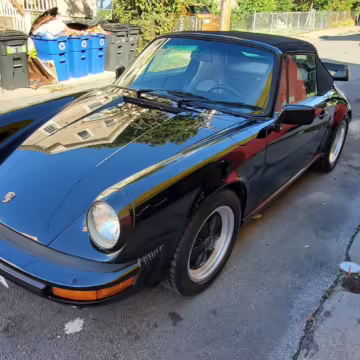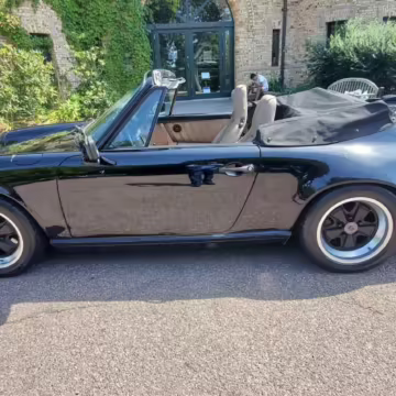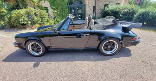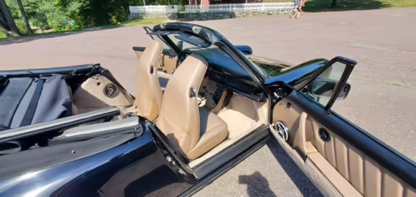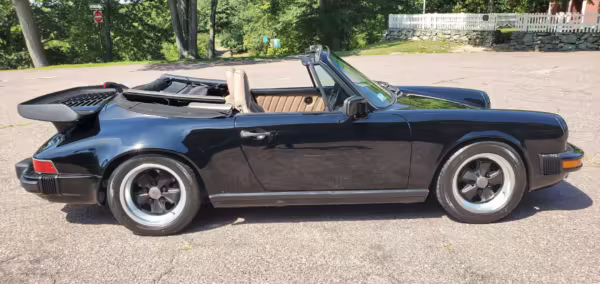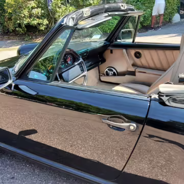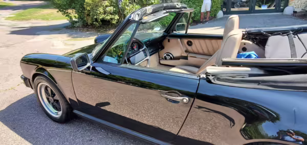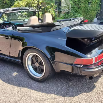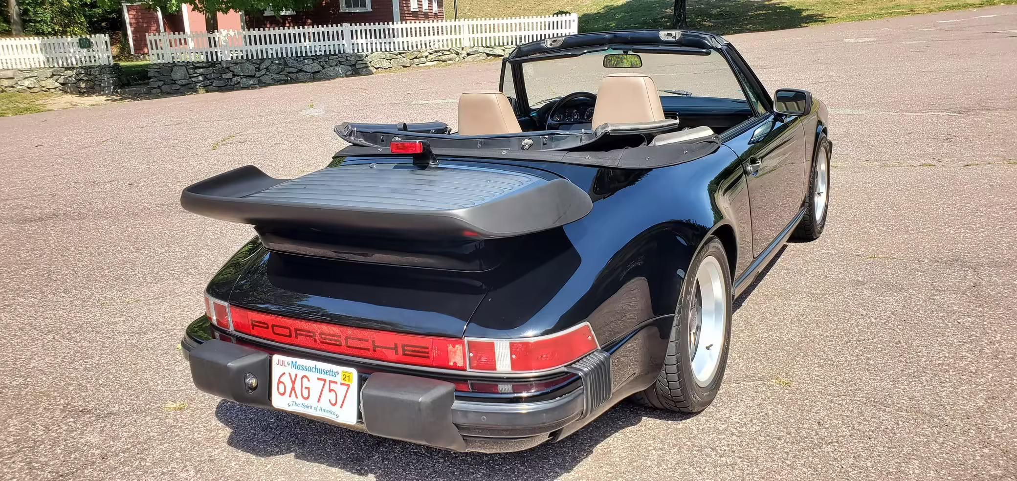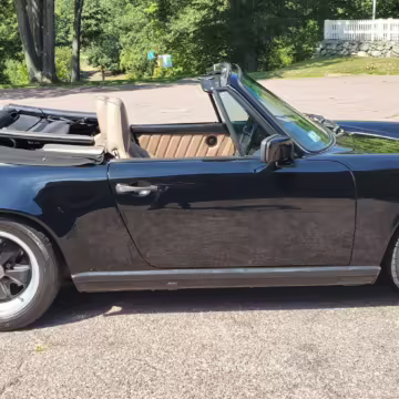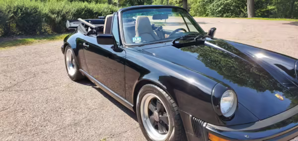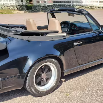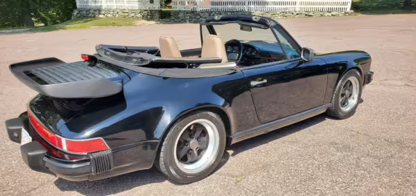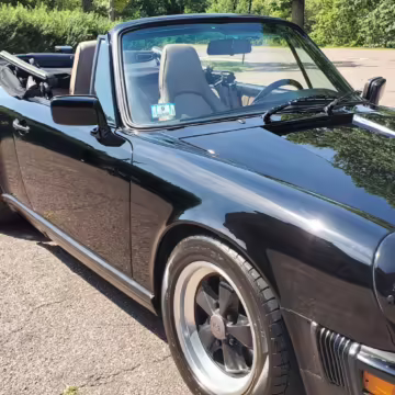 1986 Porsche 911 Carrera Cabriolet, finished in black with a tan interior.