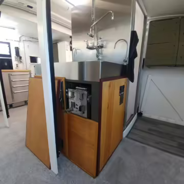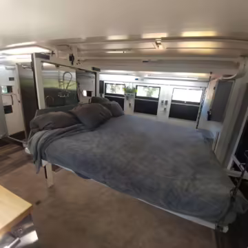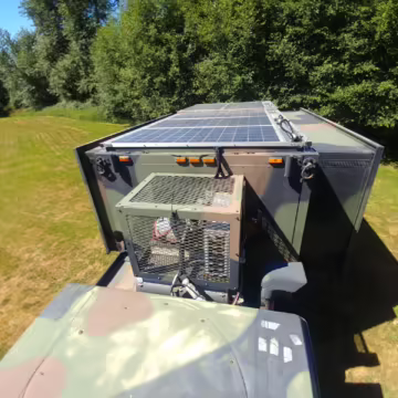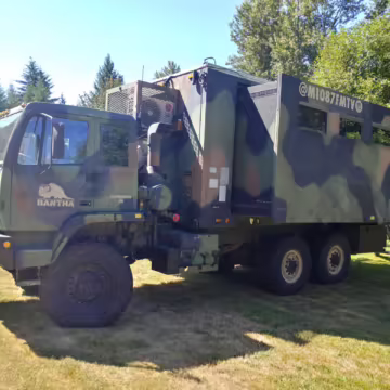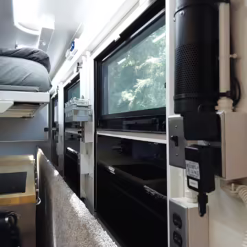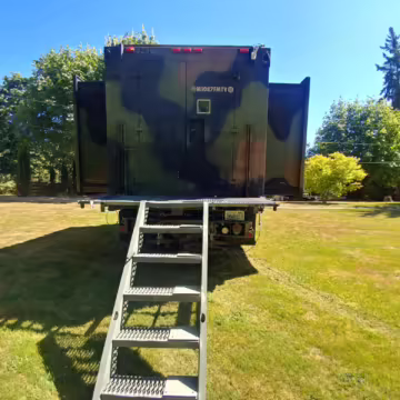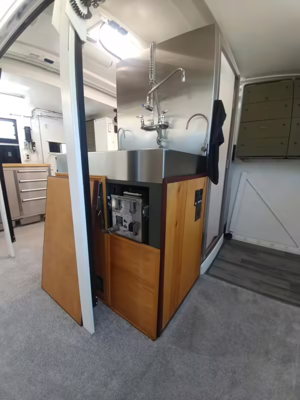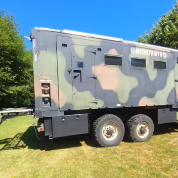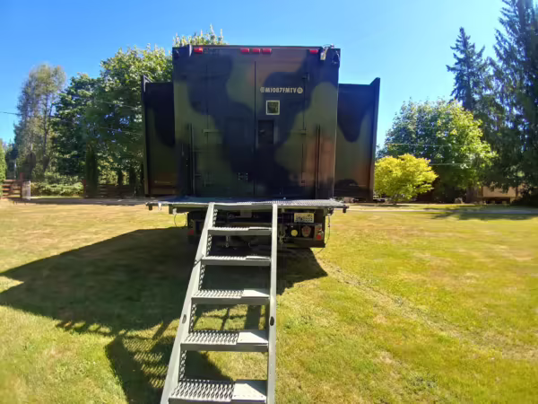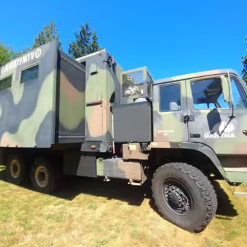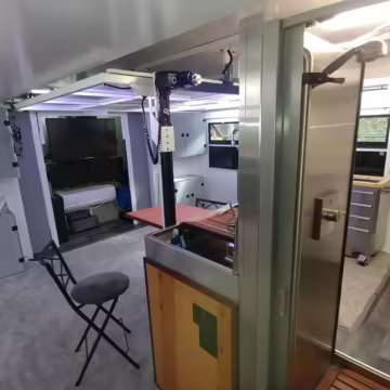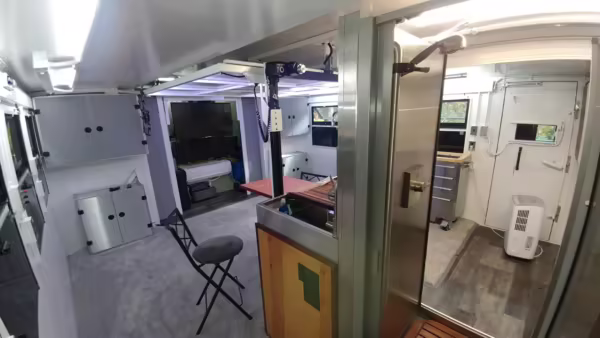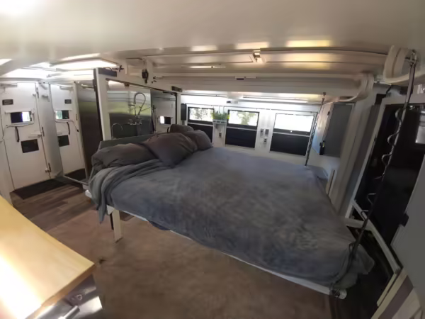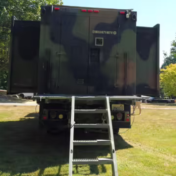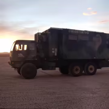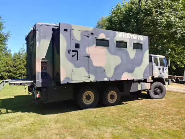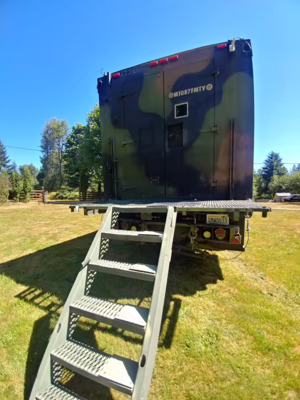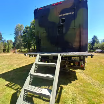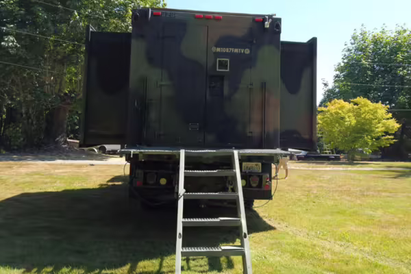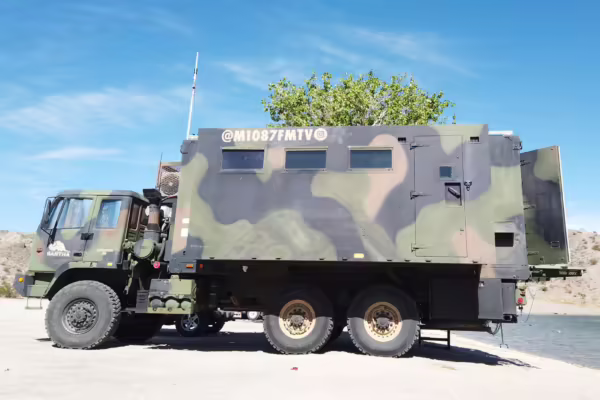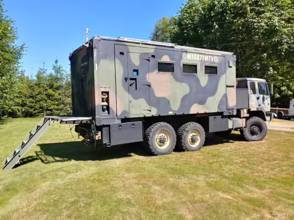 Originally configured as a command center with expandable side panels, this M1087 was converted into an RV with extra insulation, flooring, a 60-gallon fresh water tank, a stainless-steel shower, a Vitrifrigo DRW180 refrigerator and freezer unit, a Sony X750H 55-inch 4K Ultra HD LED television, a king-sized memory foam mattress on a lift system, a cassette toilet, roof-mounted solar panels, Guangzhou Felicity Solar Technology LiFePO4 battery packs, and a weBoost cell signal booster, among numerous other modifications. More details about the motorhome conversion are provided below.