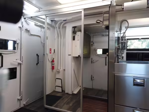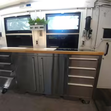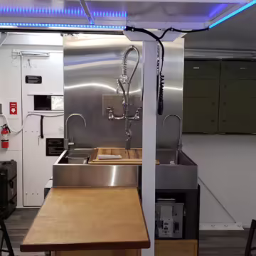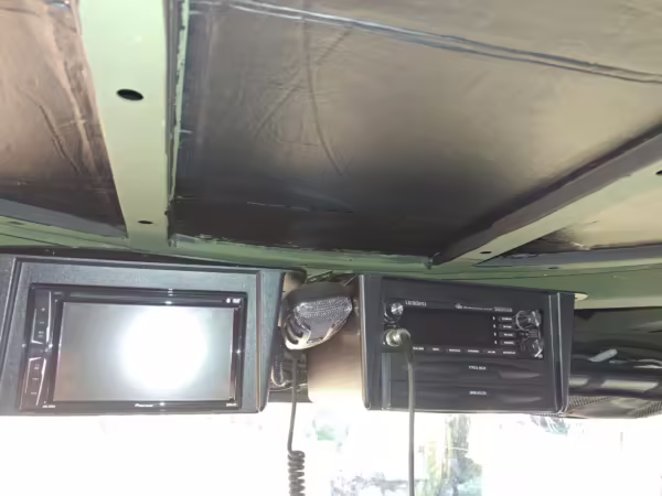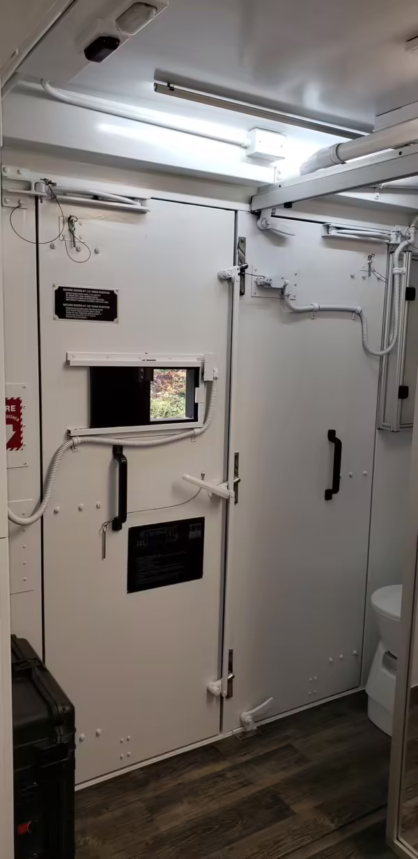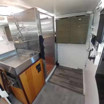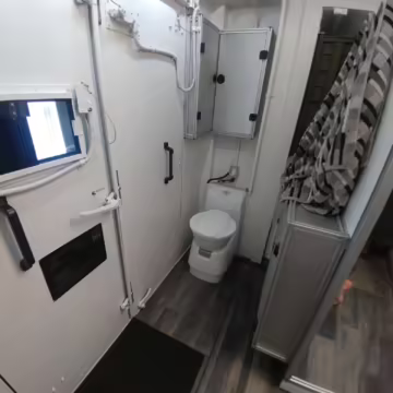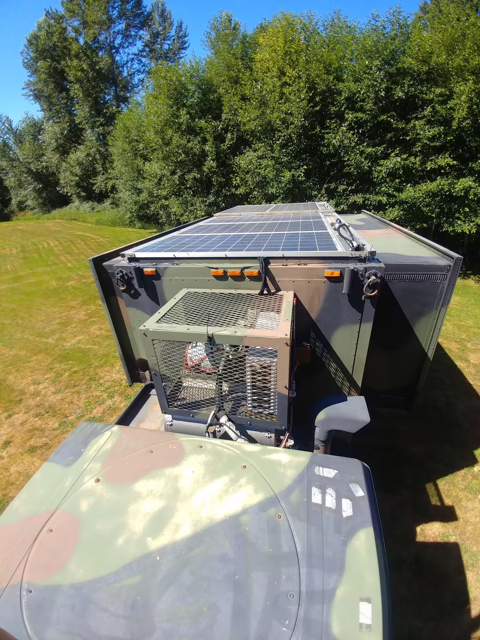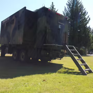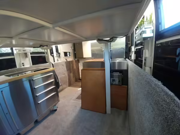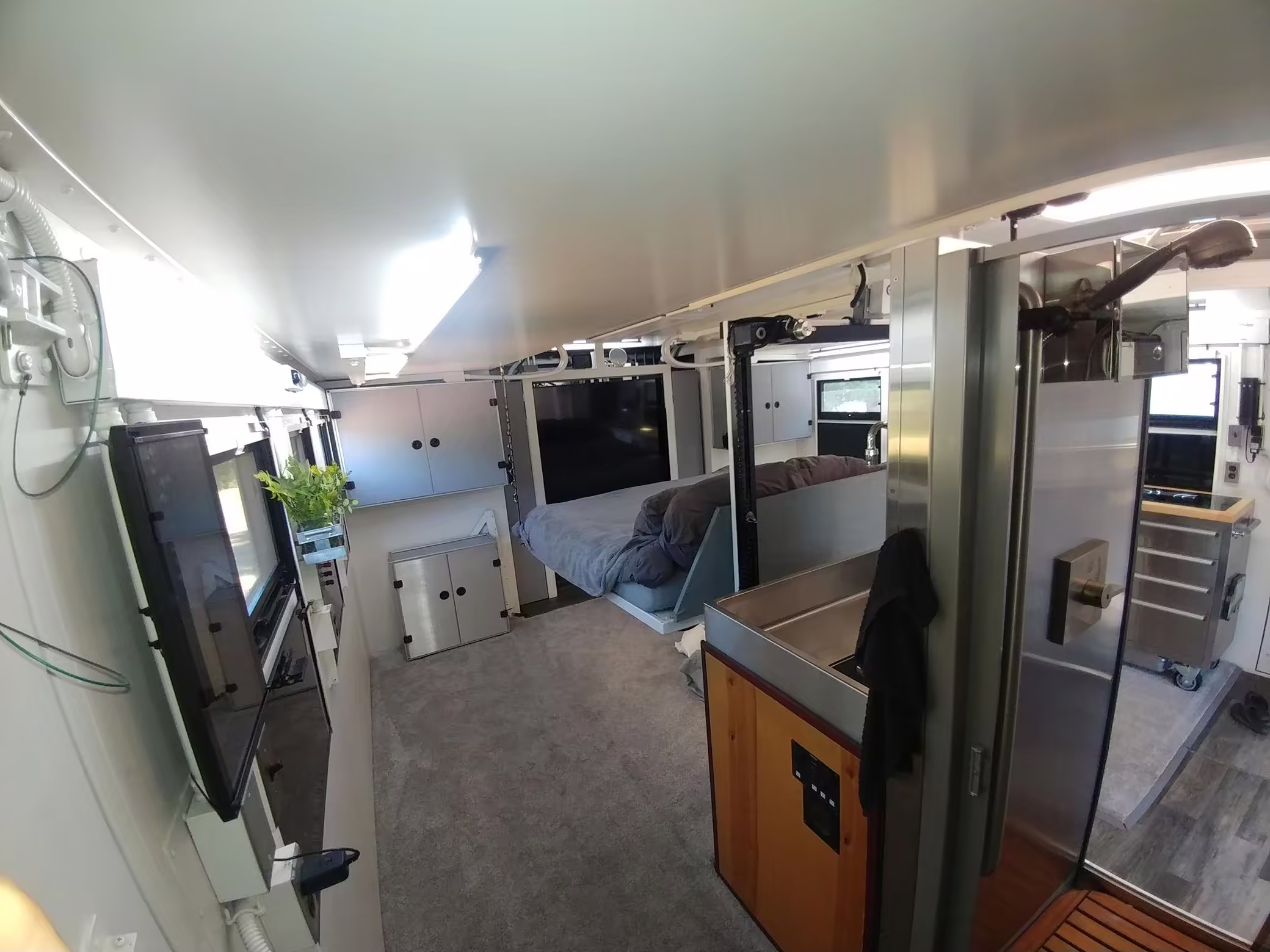 Originally configured as a command center with expandable side panels, this M1087 was converted into an RV with extra insulation, flooring, a 60-gallon fresh water tank, a stainless-steel shower, a Vitrifrigo DRW180 refrigerator and freezer unit, a Sony X750H 55-inch 4K Ultra HD LED television, a king-sized memory foam mattress on a lift system, a cassette toilet, roof-mounted solar panels, Guangzhou Felicity Solar Technology LiFePO4 battery packs, and a weBoost cell signal booster, among numerous other modifications. More details about the motorhome conversion are provided below.