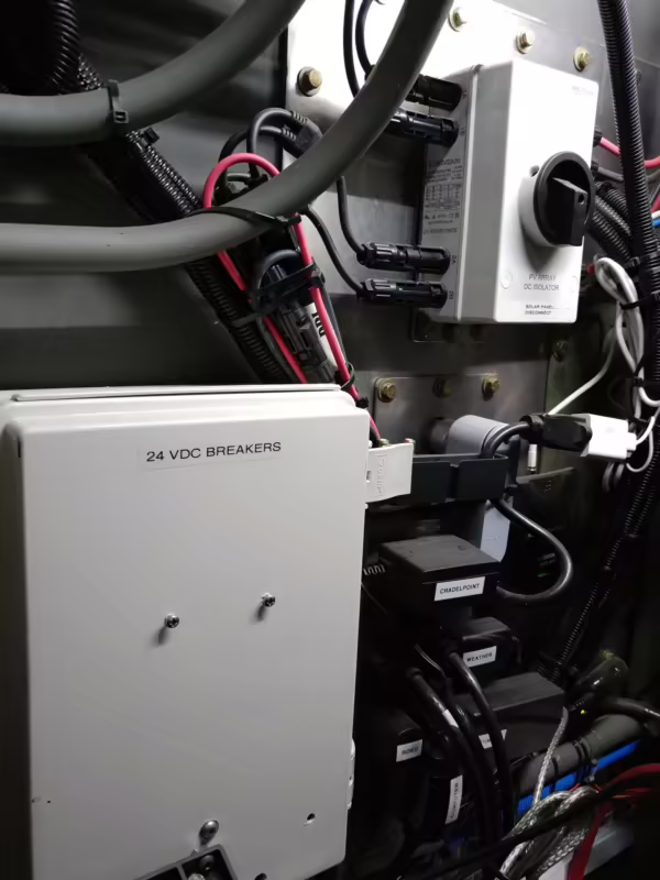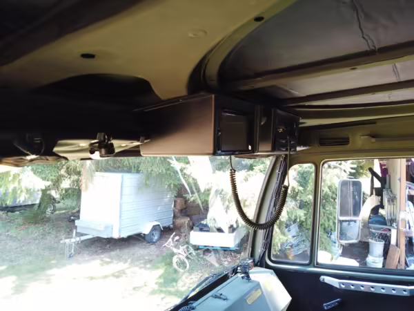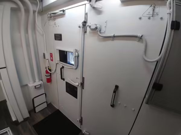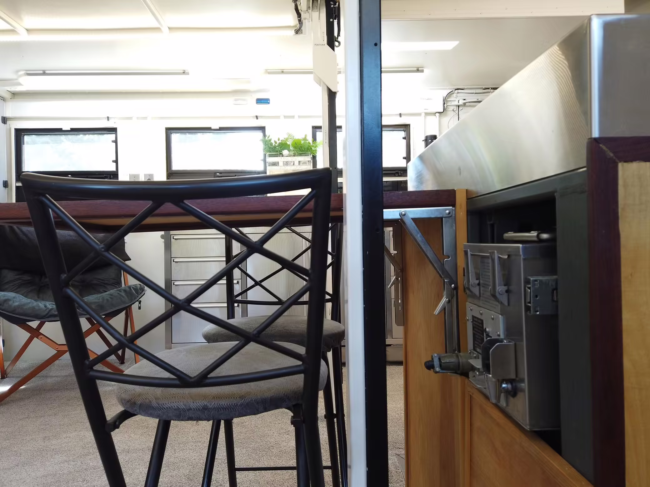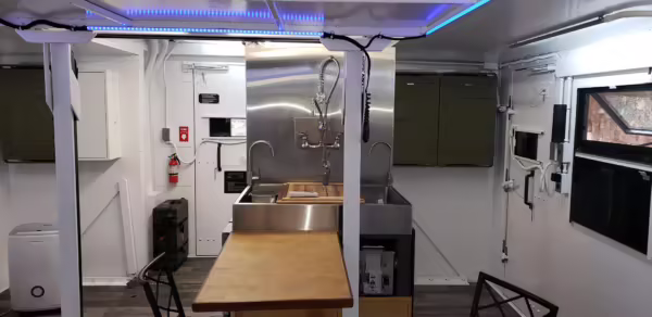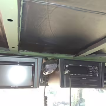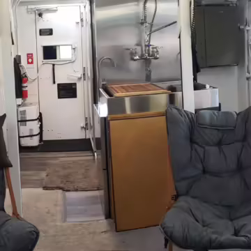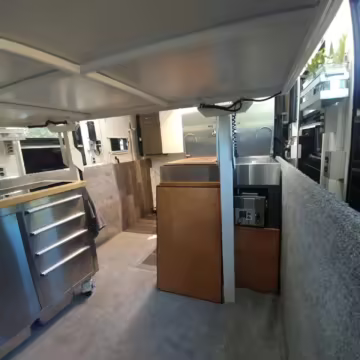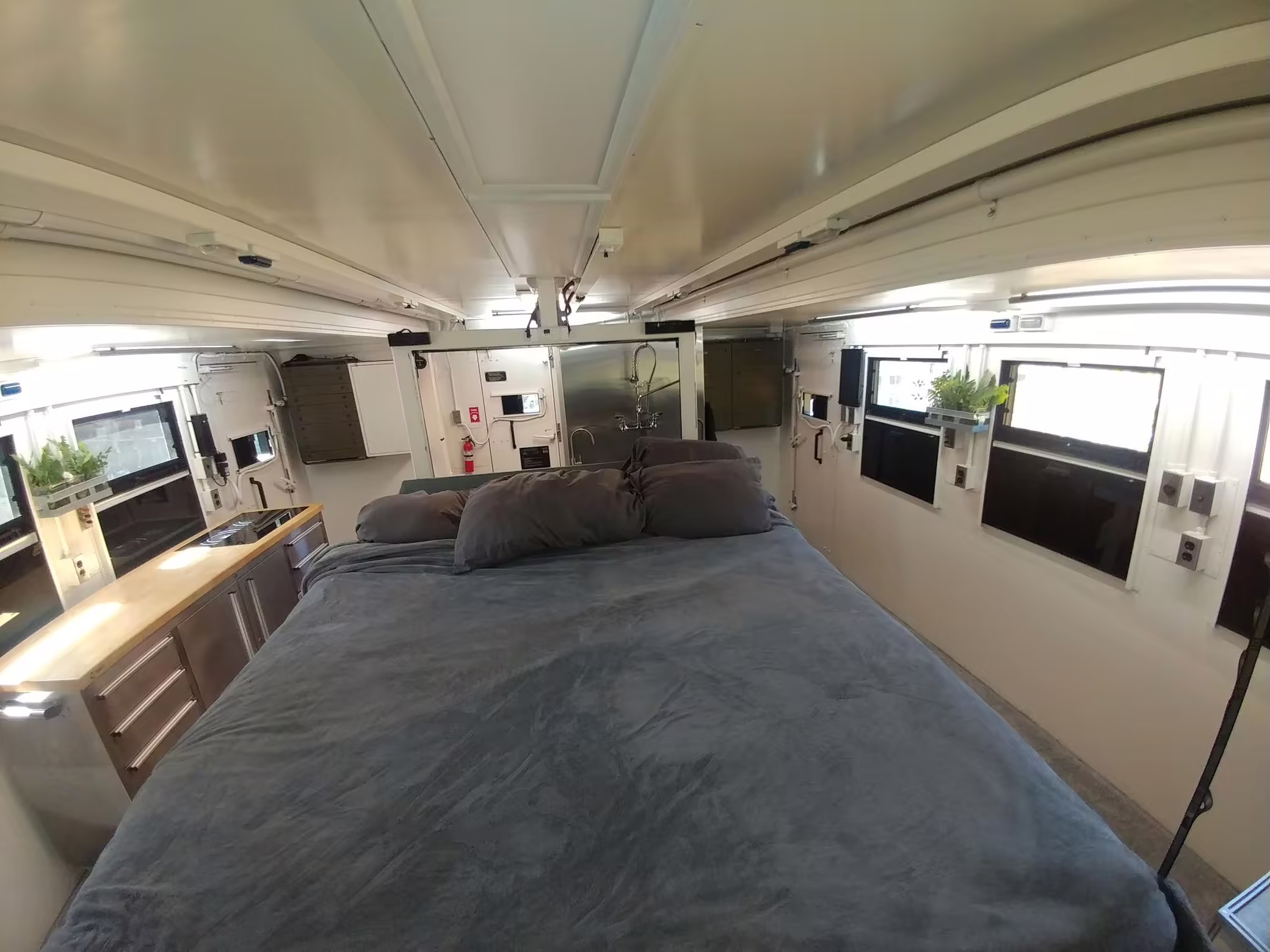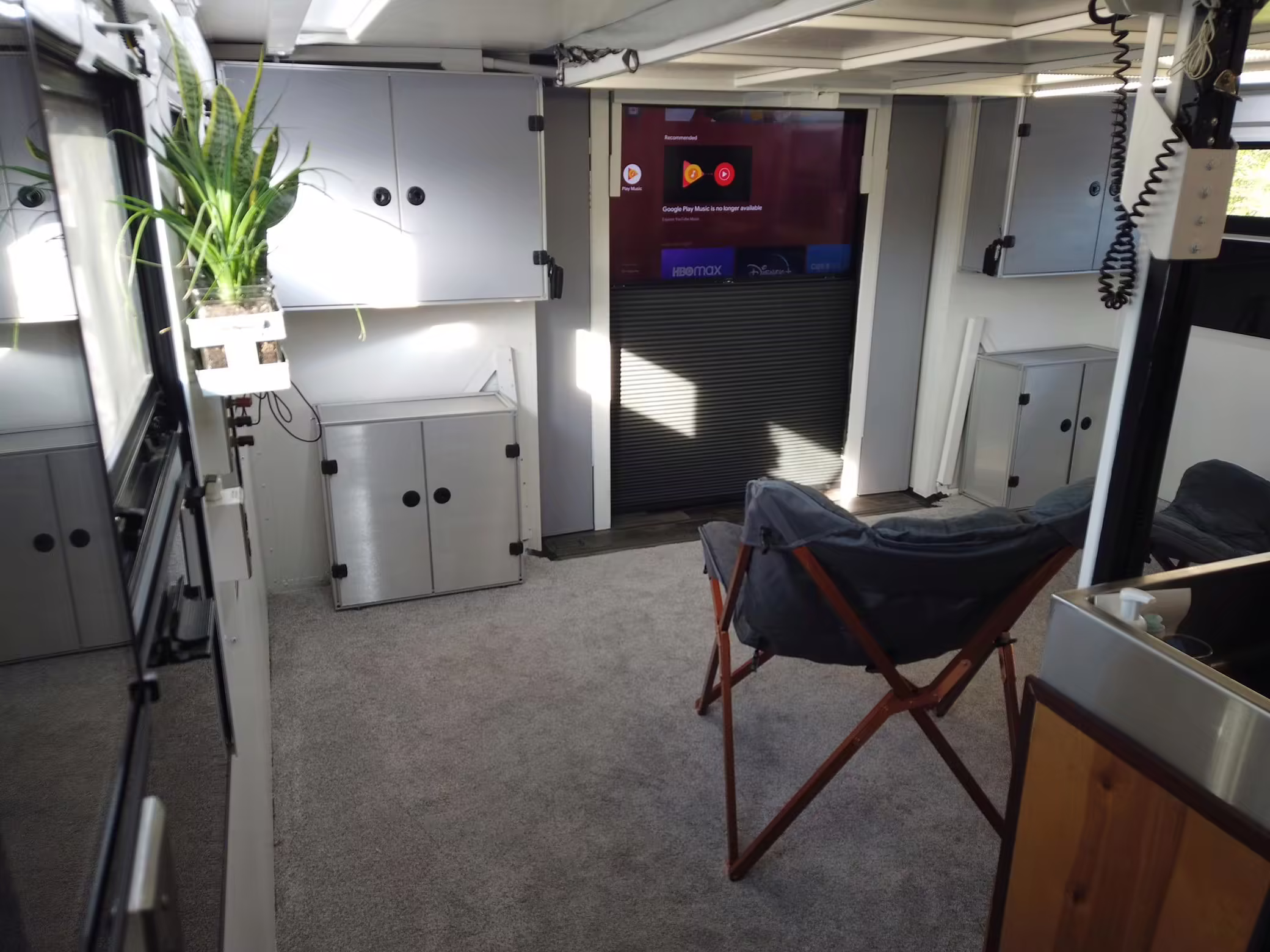 Originally configured as a command center with expandable side panels, this M1087 was converted into an RV with extra insulation, flooring, a 60-gallon fresh water tank, a stainless-steel shower, a Vitrifrigo DRW180 refrigerator and freezer unit, a Sony X750H 55-inch 4K Ultra HD LED television, a king-sized memory foam mattress on a lift system, a cassette toilet, roof-mounted solar panels, Guangzhou Felicity Solar Technology LiFePO4 battery packs, and a weBoost cell signal booster, among numerous other modifications. More details about the motorhome conversion are provided below.