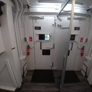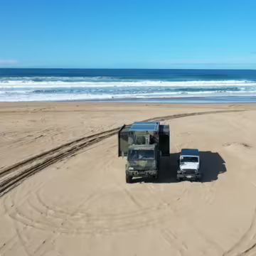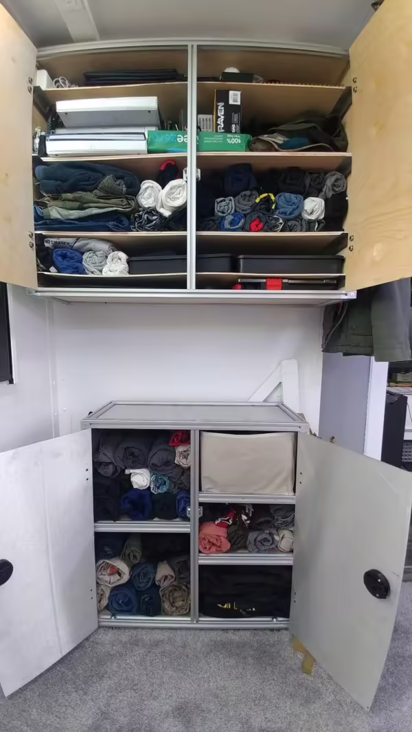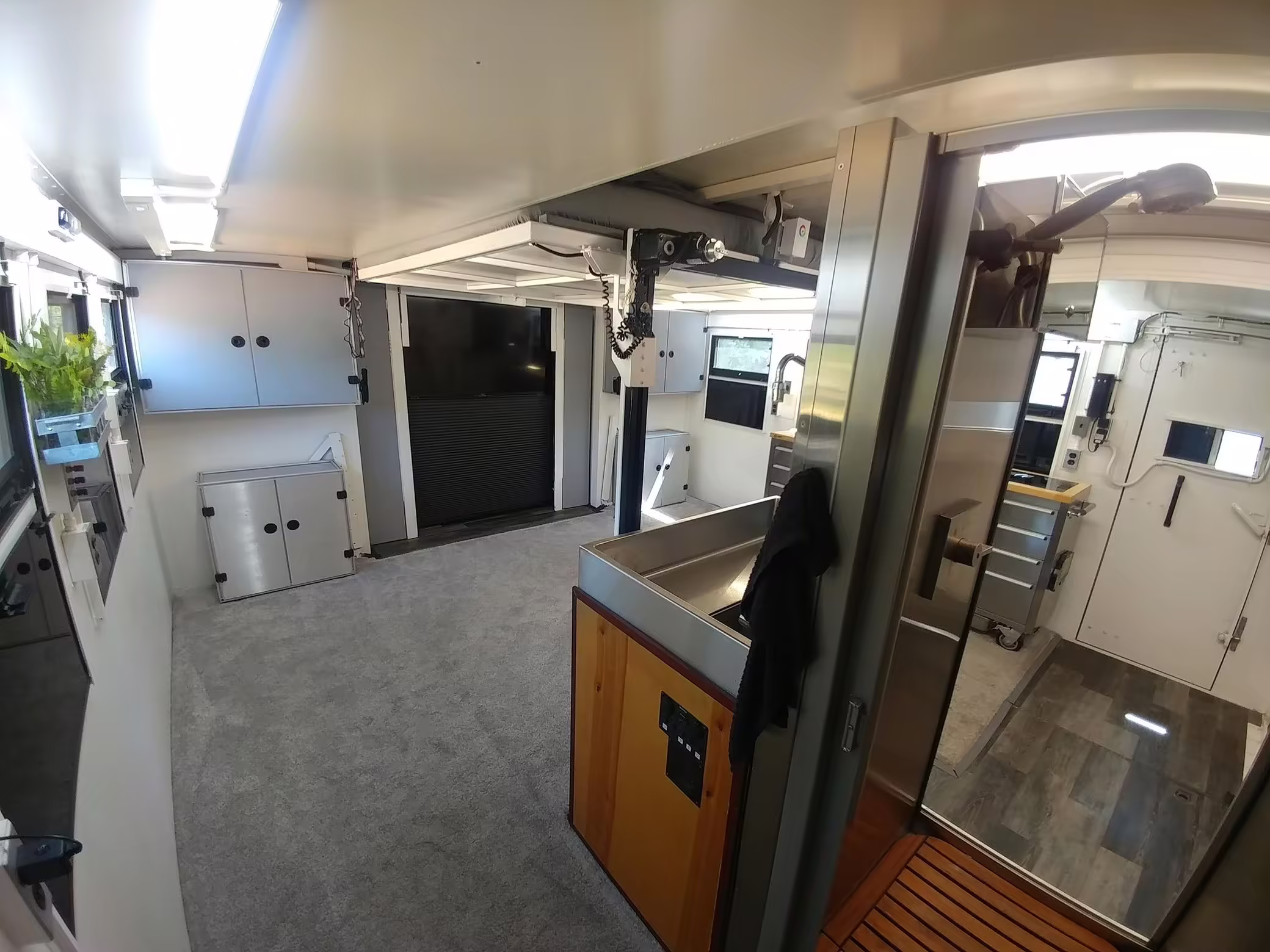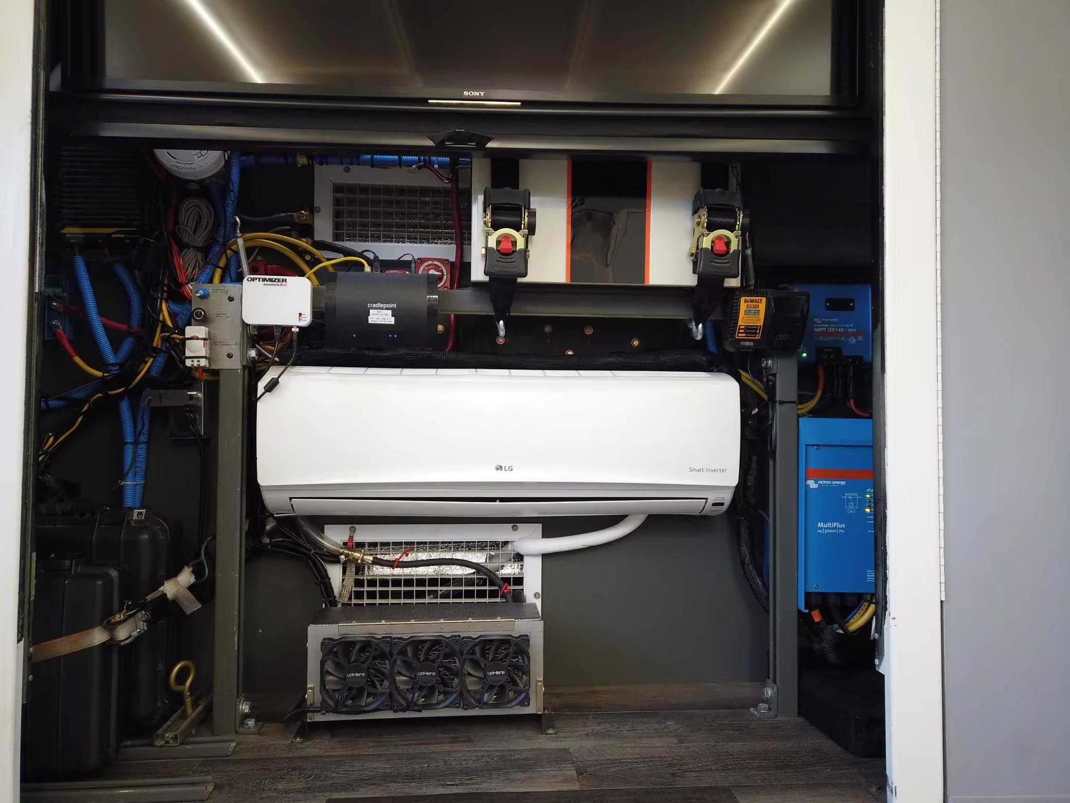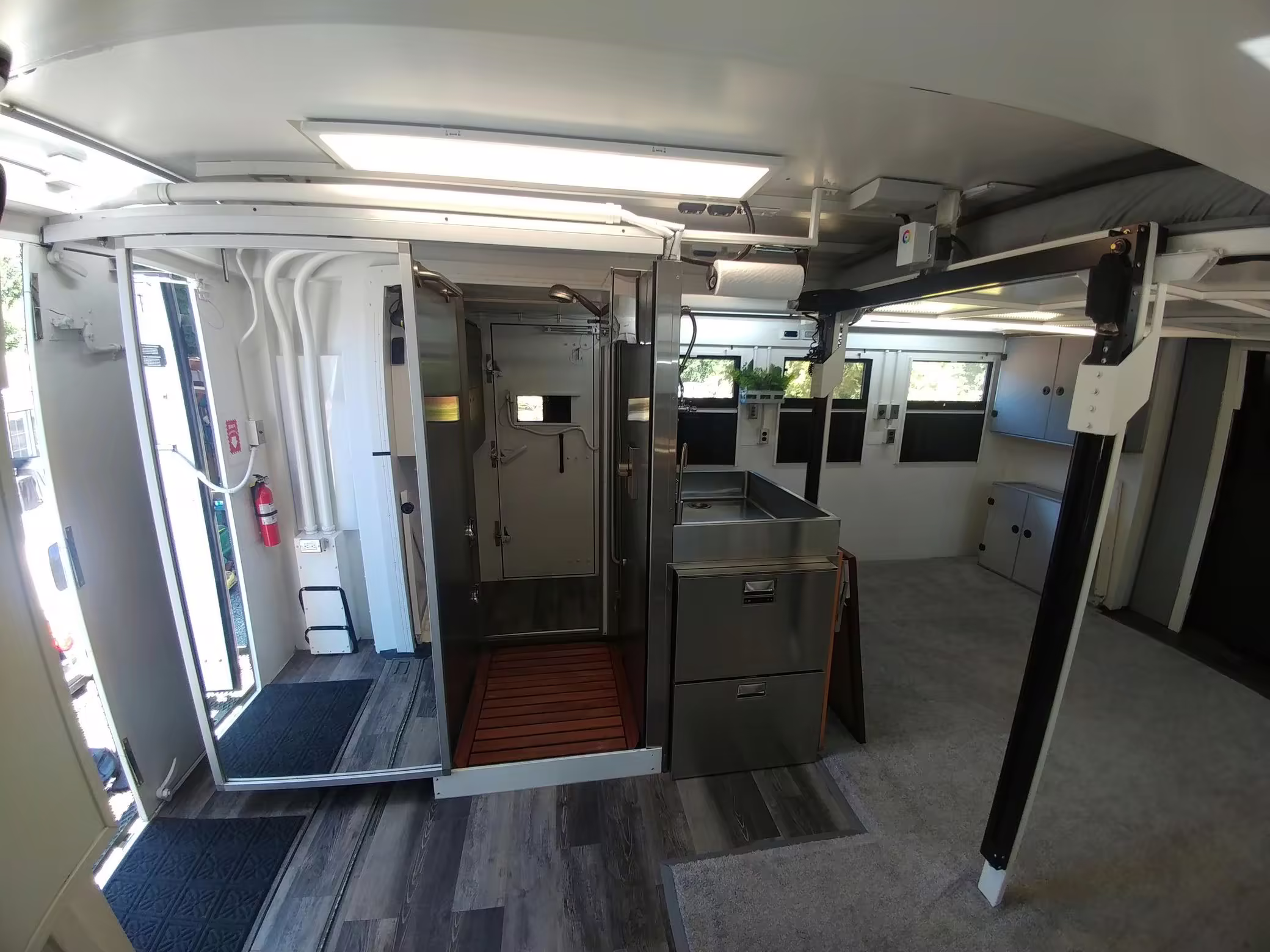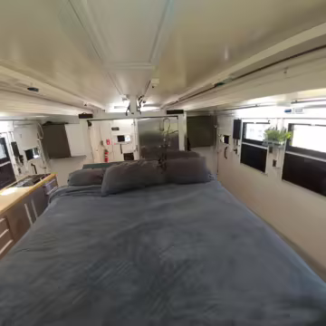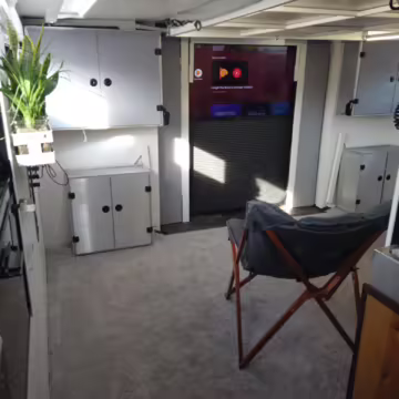 Originally configured as a command center with expandable side panels, this M1087 was converted into an RV with extra insulation, flooring, a 60-gallon fresh water tank, a stainless-steel shower, a Vitrifrigo DRW180 refrigerator and freezer unit, a Sony X750H 55-inch 4K Ultra HD LED television, a king-sized memory foam mattress on a lift system, a cassette toilet, roof-mounted solar panels, Guangzhou Felicity Solar Technology LiFePO4 battery packs, and a weBoost cell signal booster, among numerous other modifications. More details about the motorhome conversion are provided below.