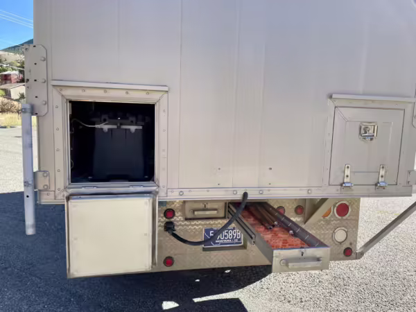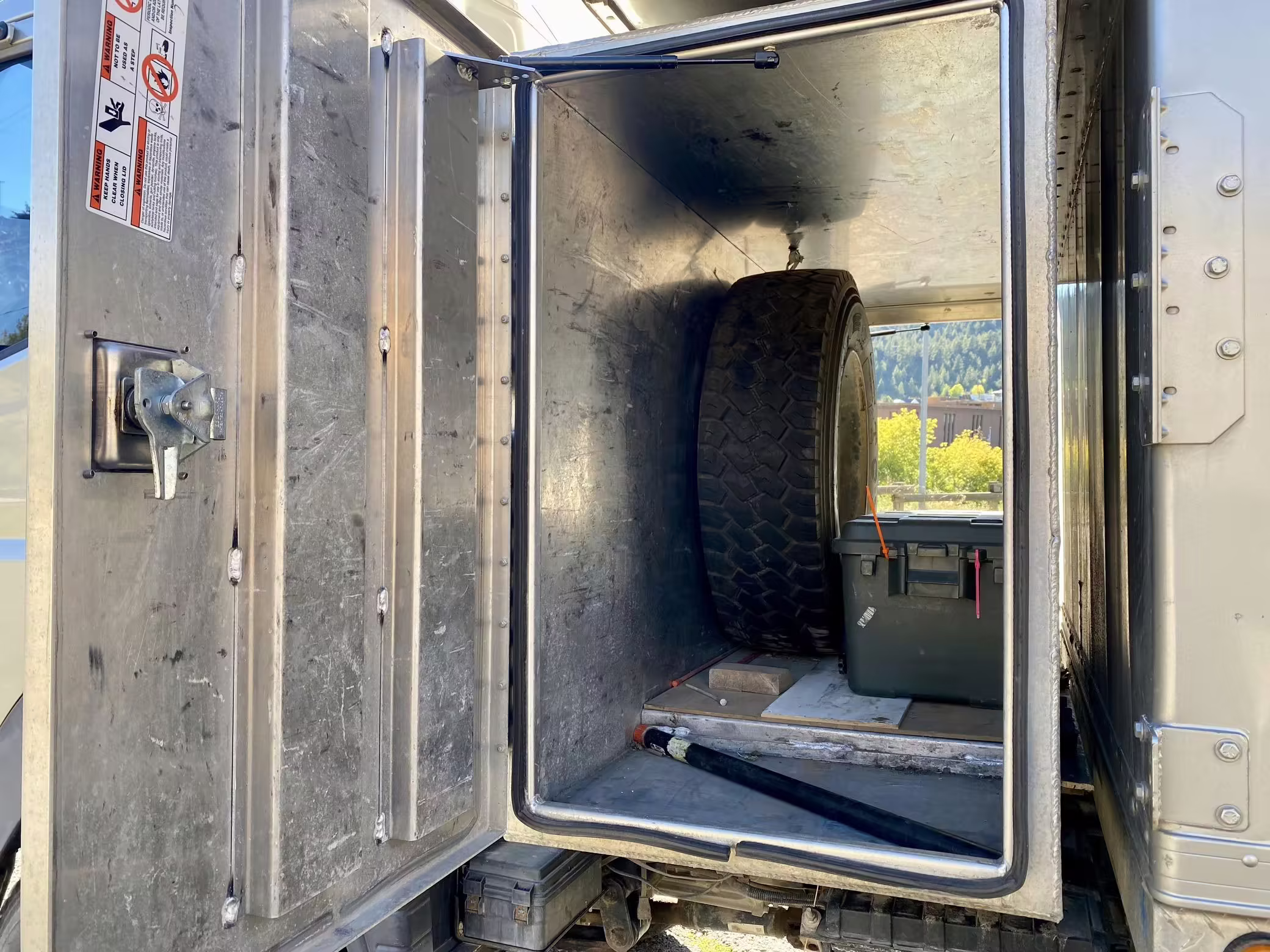 A partial list of modifications reported by the seller includes 19.5-inch Rickson “Super Single” wheels, a large exterior storage compartment, a fold-down aluminum porch platform, a wet room with toilet and shower, LED cabin lighting, a sink, refrigerator, and cooktop.