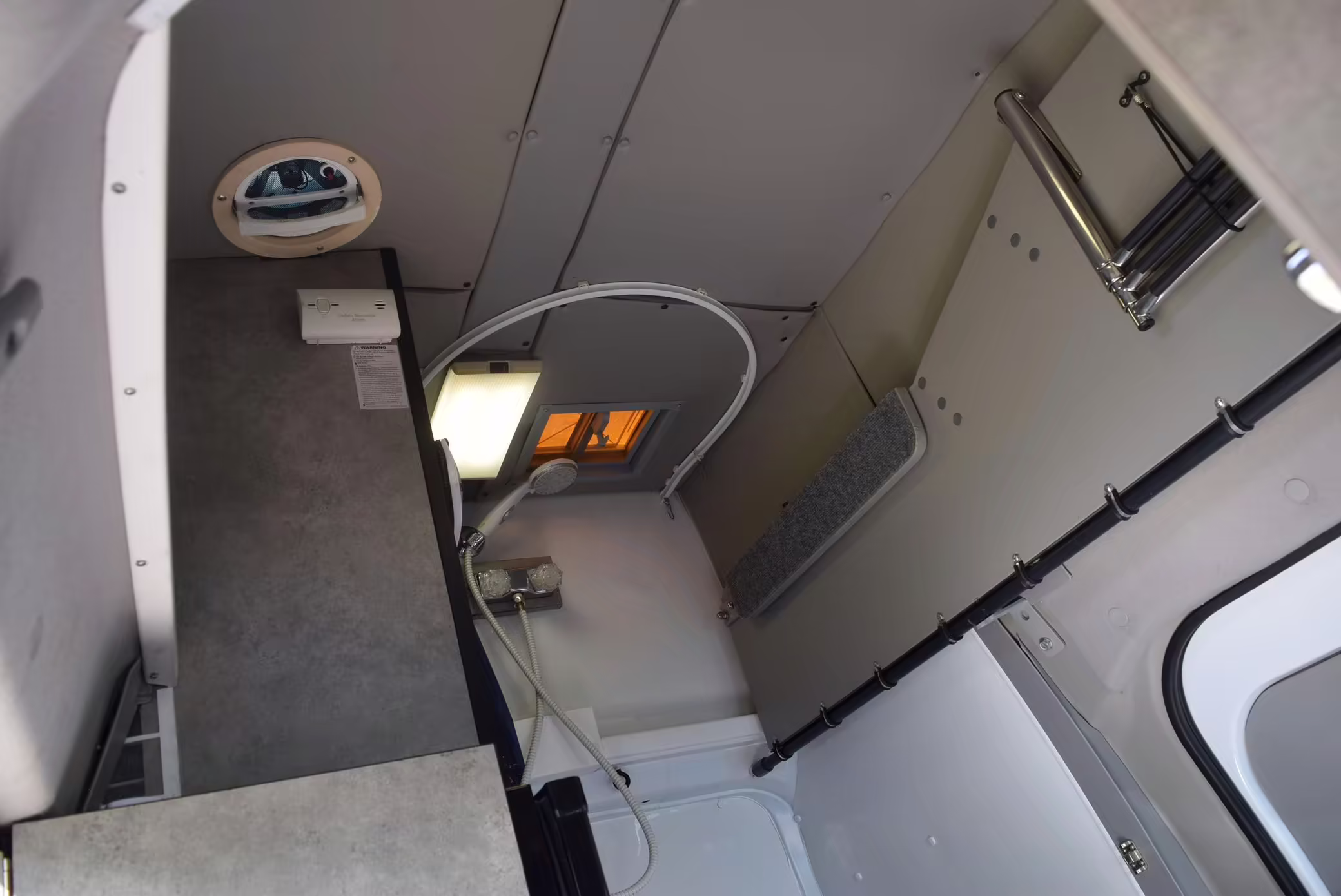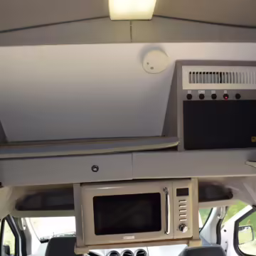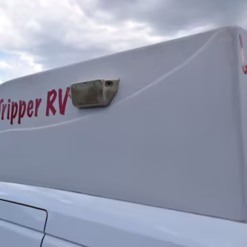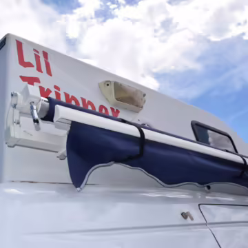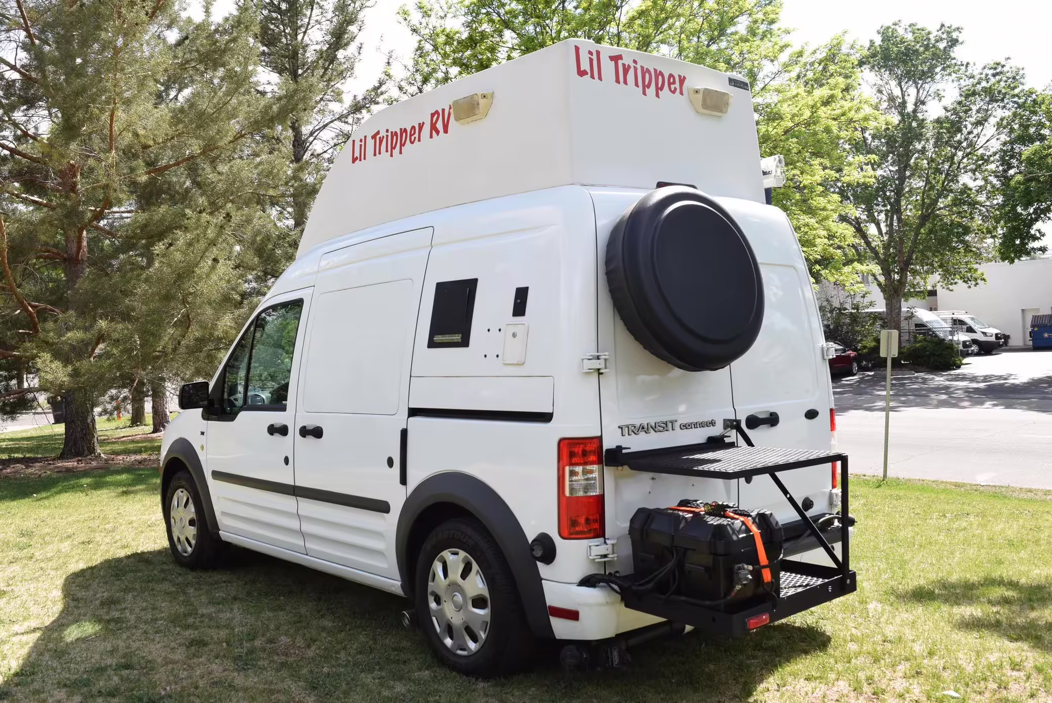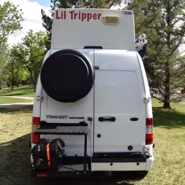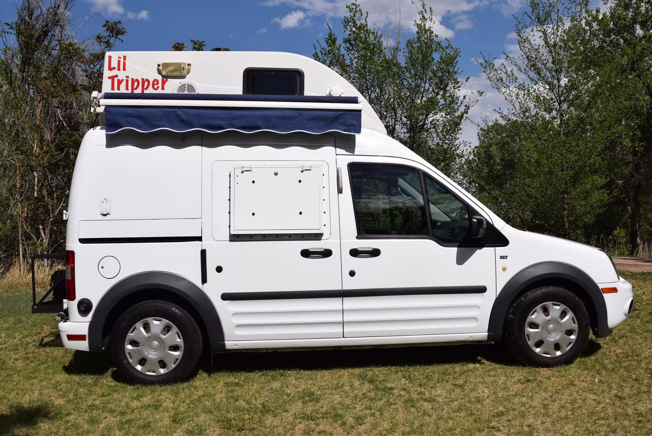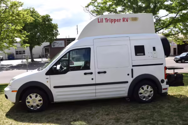 Outfitted by PeeWee Campers, a partial list of modifications includes a high roof with vent, a roll-out awning, external lighting, an externally-mounted propane camp stove, a 2-person convertible dinette, refrigerator, microwave, sink, toilet, shower, and dual 6V batteries.