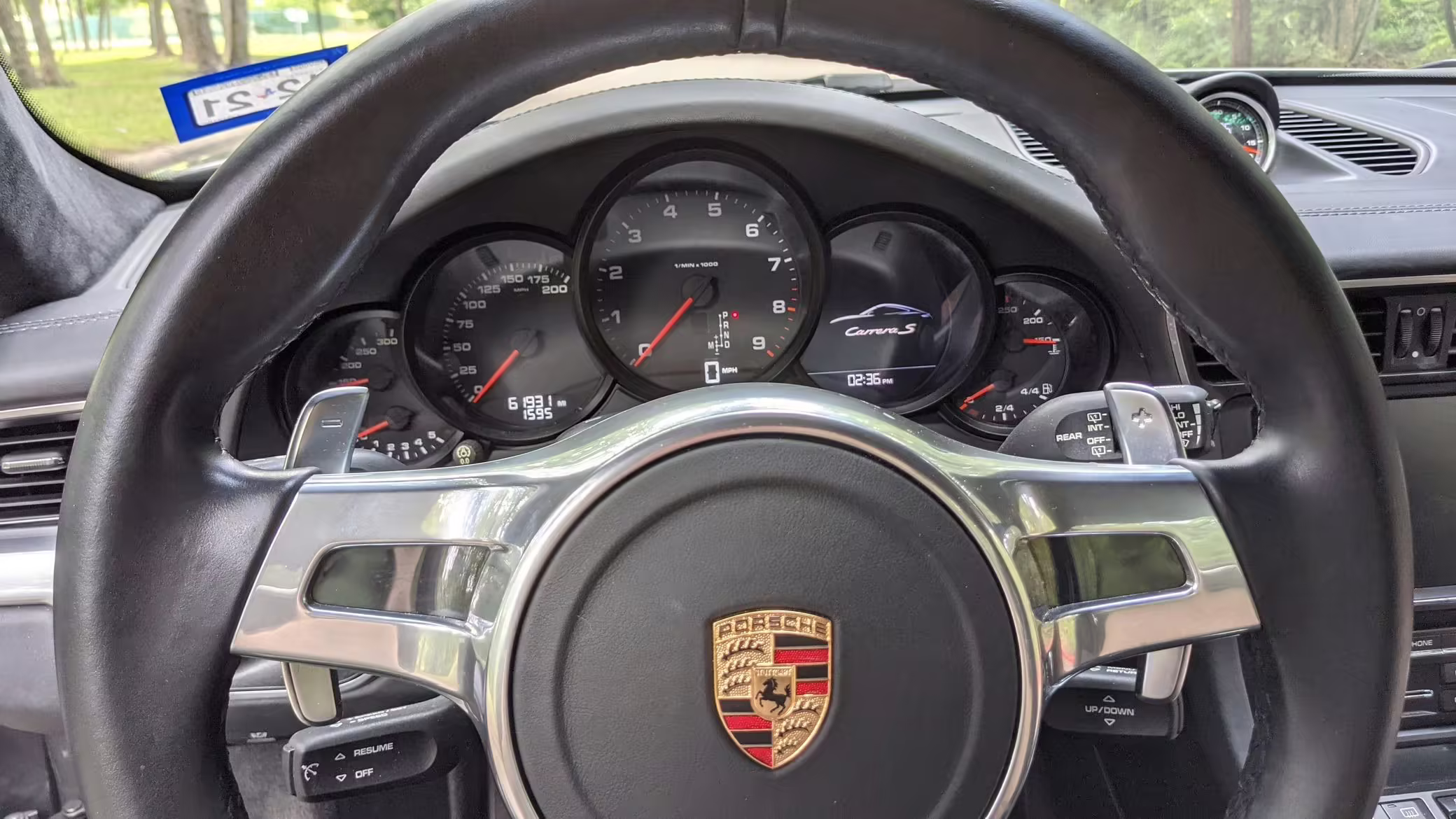 An included window sticker shows this Carrera carried a sticker price of $125,770 and came equipped with the Premium Package Plus (bi-xenon headlights, Porsche Dynamic Light System, Porsche Entry & Drive, auto-dimming mirrors, 18-way power-adjustable front seats, heated and cooled adaptive front seats), the Sport Chrono Package, Porsche Dynamic Chassis Control, a sport exhaust, automatic climate control, a Bose surround sound system, and more as detailed below.