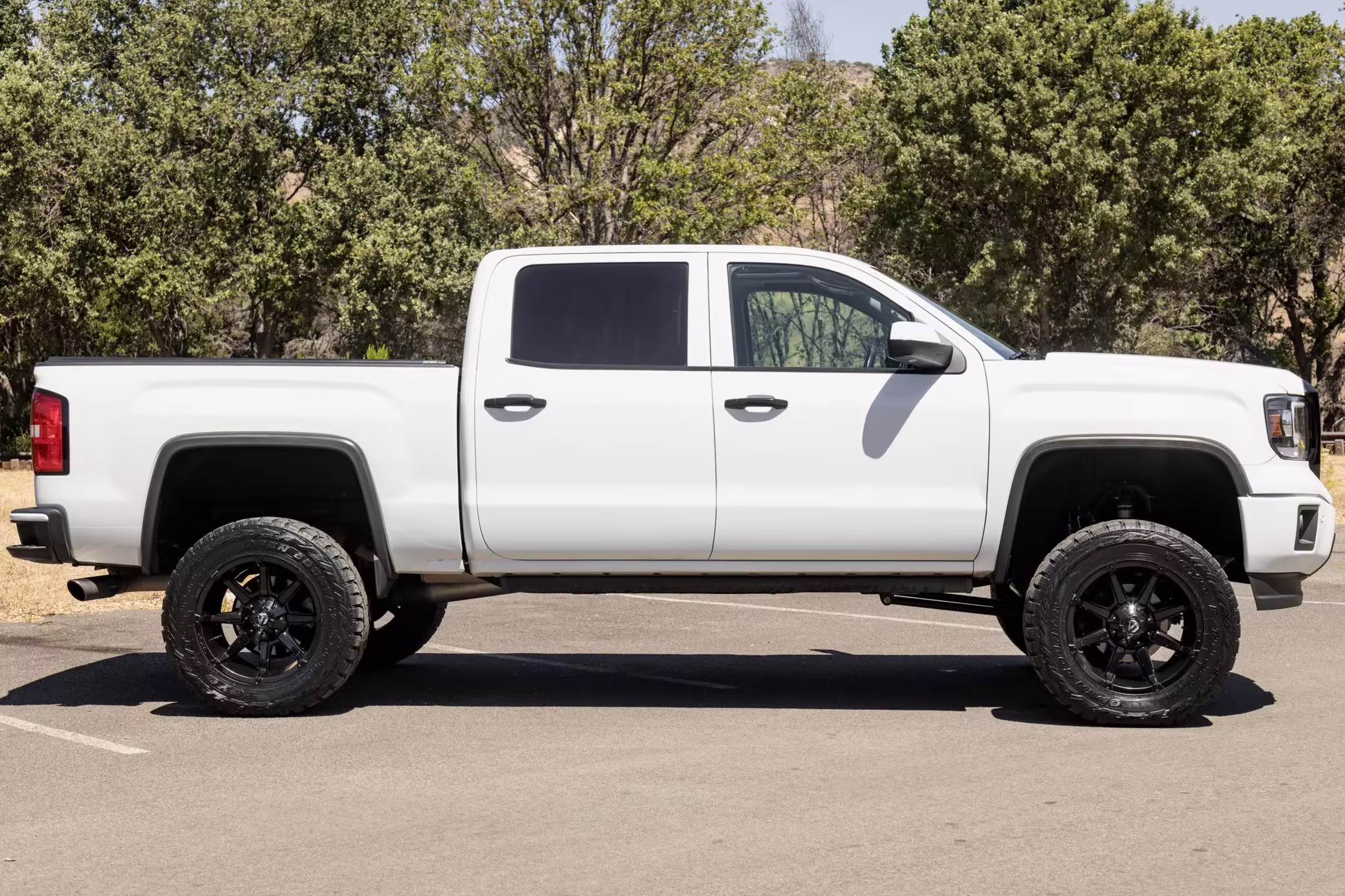Modifications reported by the seller include 20-inch Fuel Off-Road polished black wheels with Toyo R/T Open Country tires, a 6-inch Pro Comp lift kit, an S&B cold air intake box, AMP Research PowerStep automatic running boards with LED lights, LED headlights, an aftermarket black GMC Denali grille, a LINE-X spray-on bed liner, and a Retrax retractable tonneau cover.