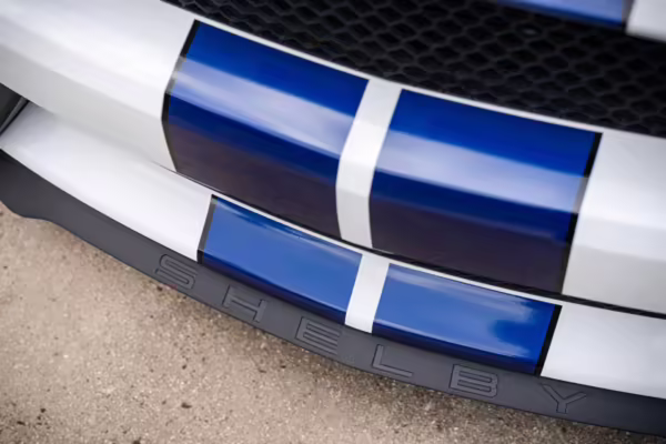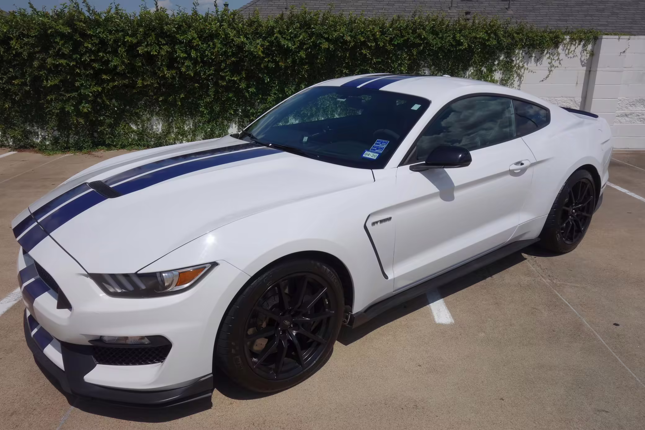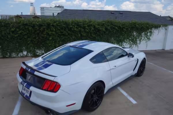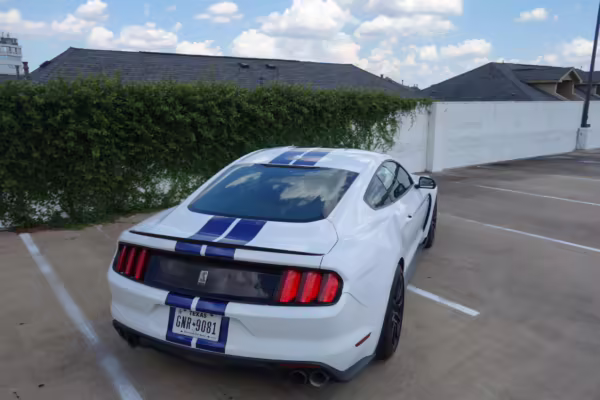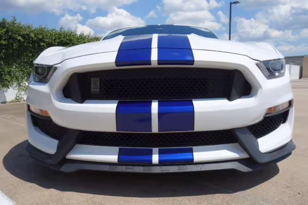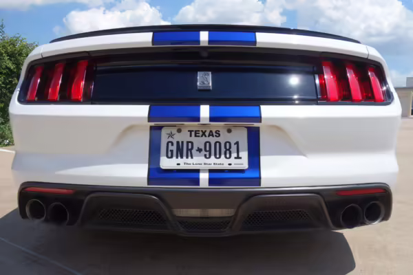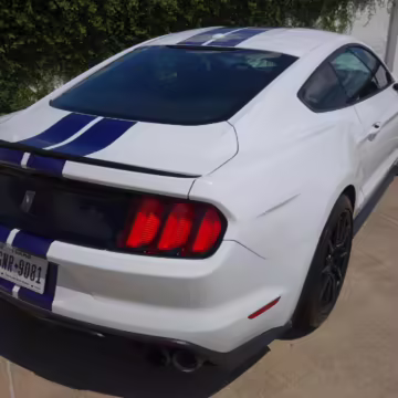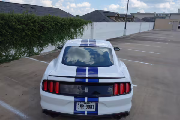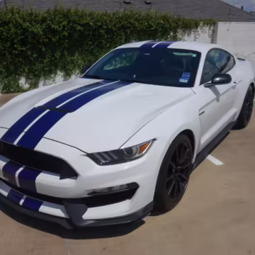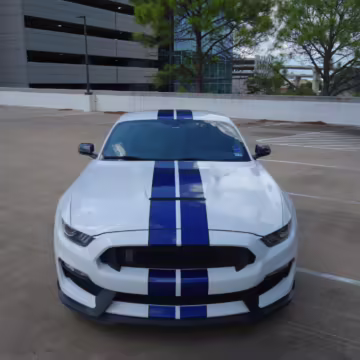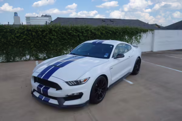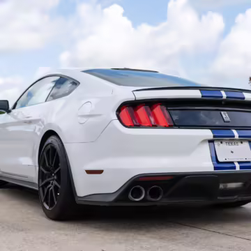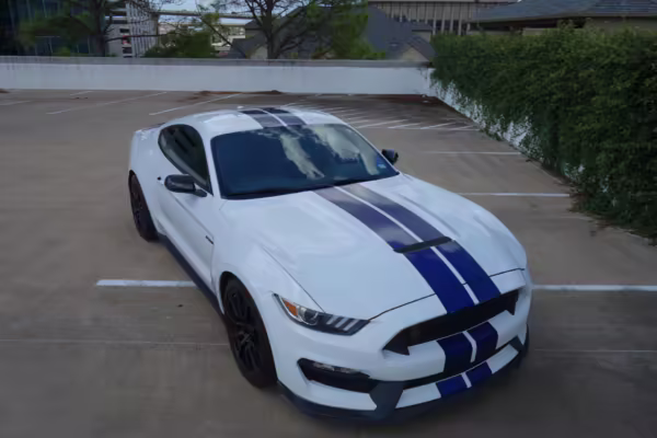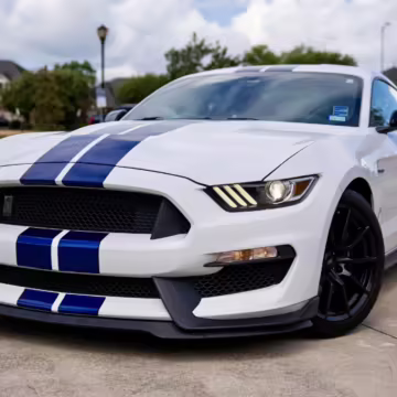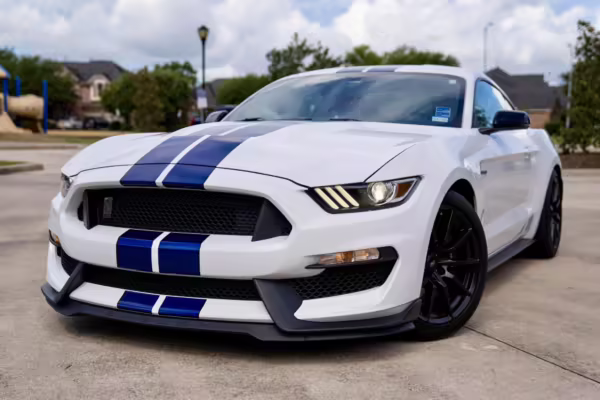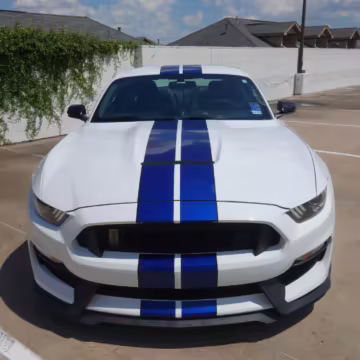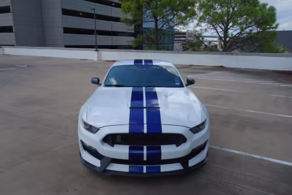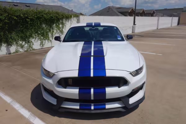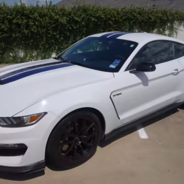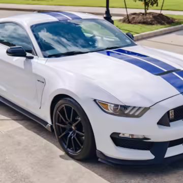 2016 Ford Mustang Shelby GT350, finished in Oxford White with Kona Blue Stripes with a black leather interior.