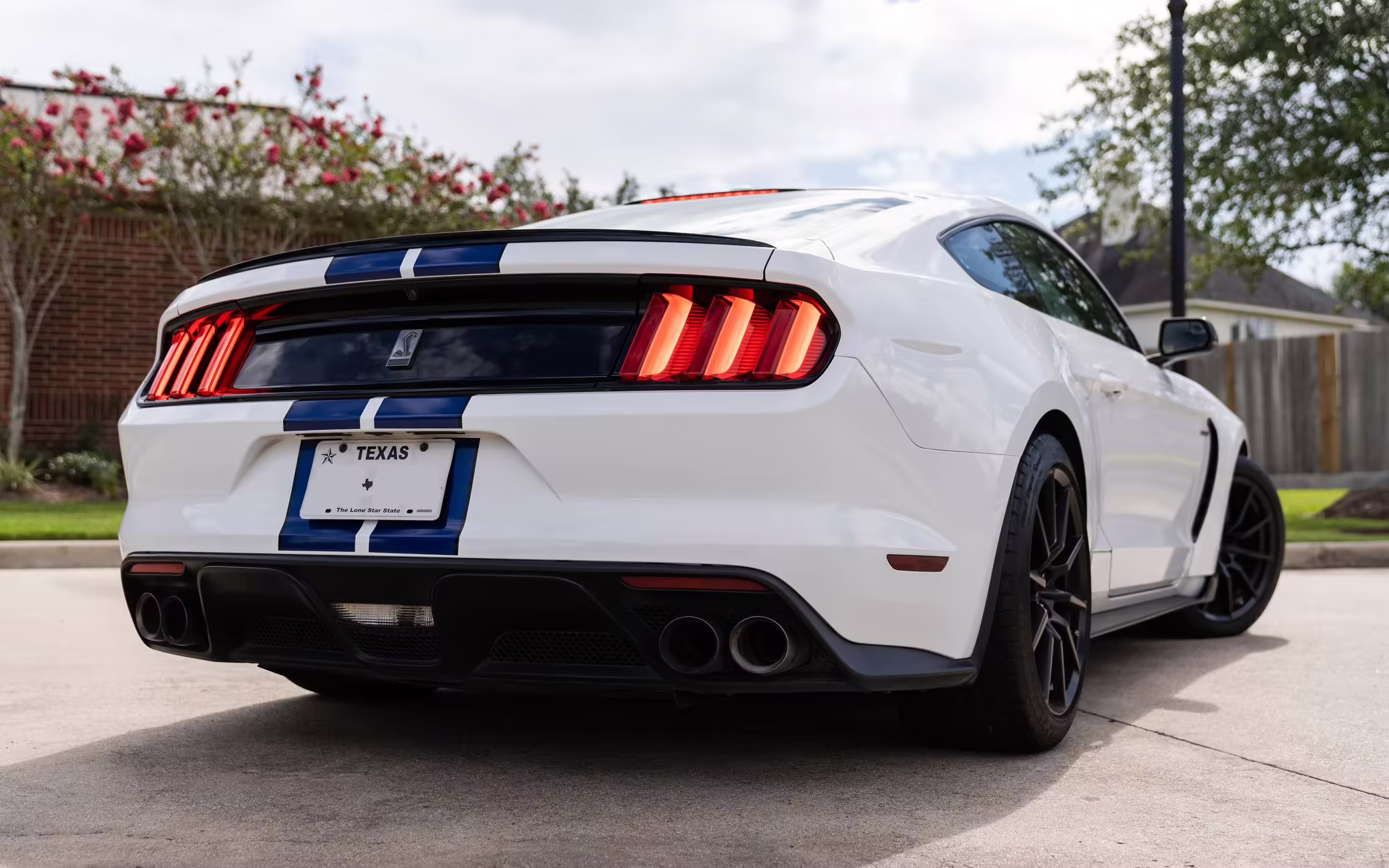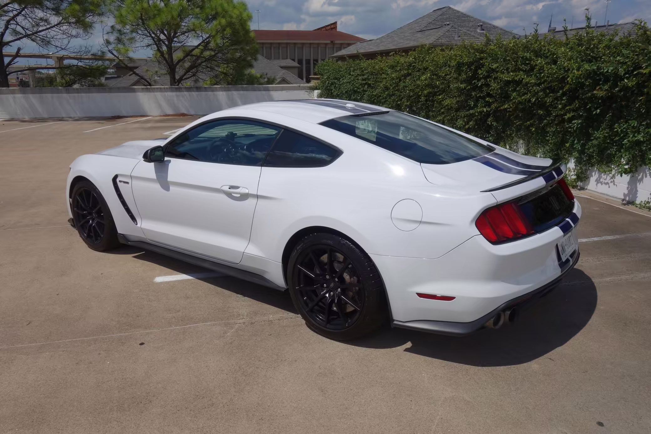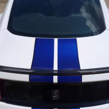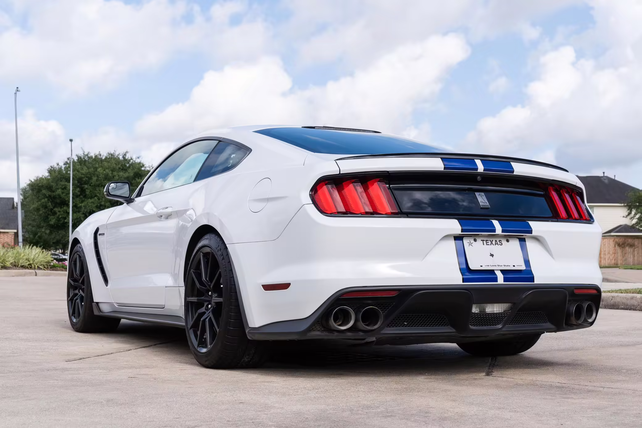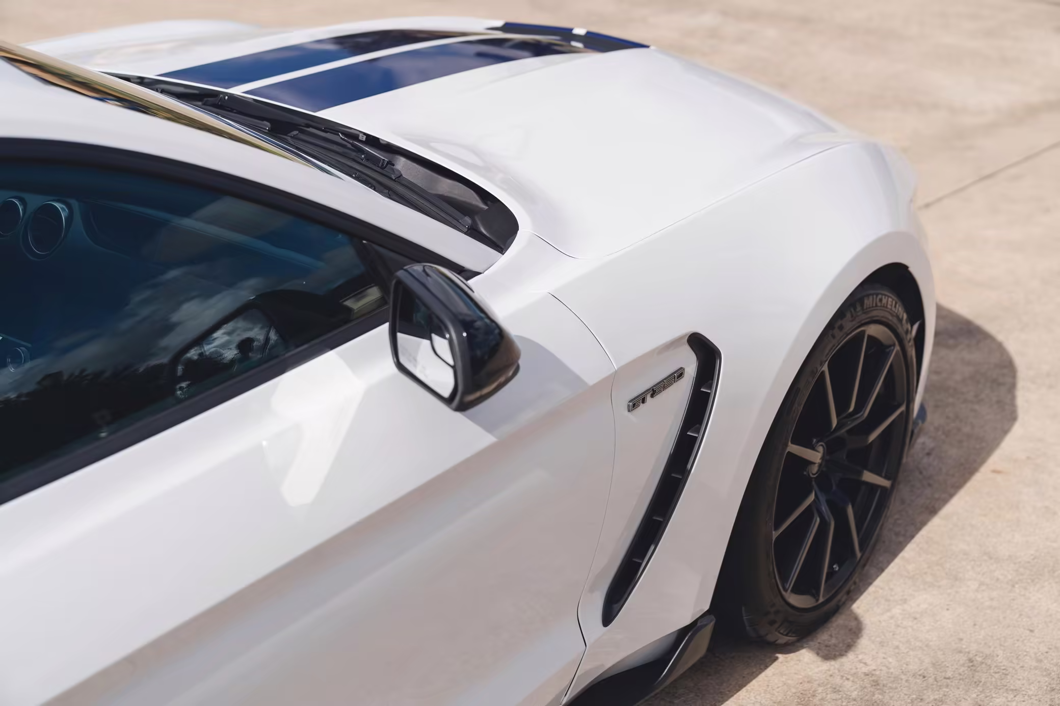 2016 Ford Mustang Shelby GT350, finished in Oxford White with Kona Blue Stripes with a black leather interior.