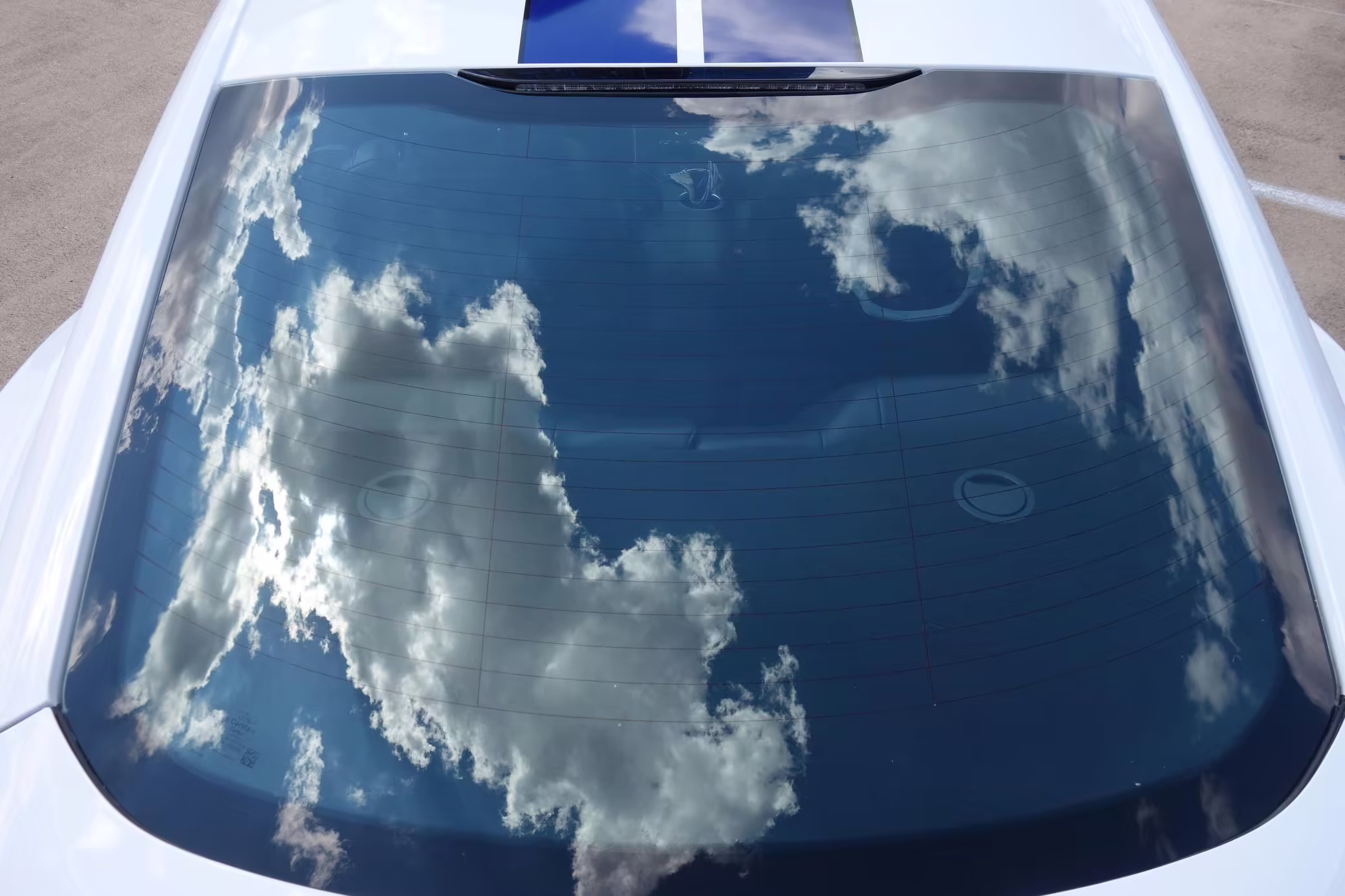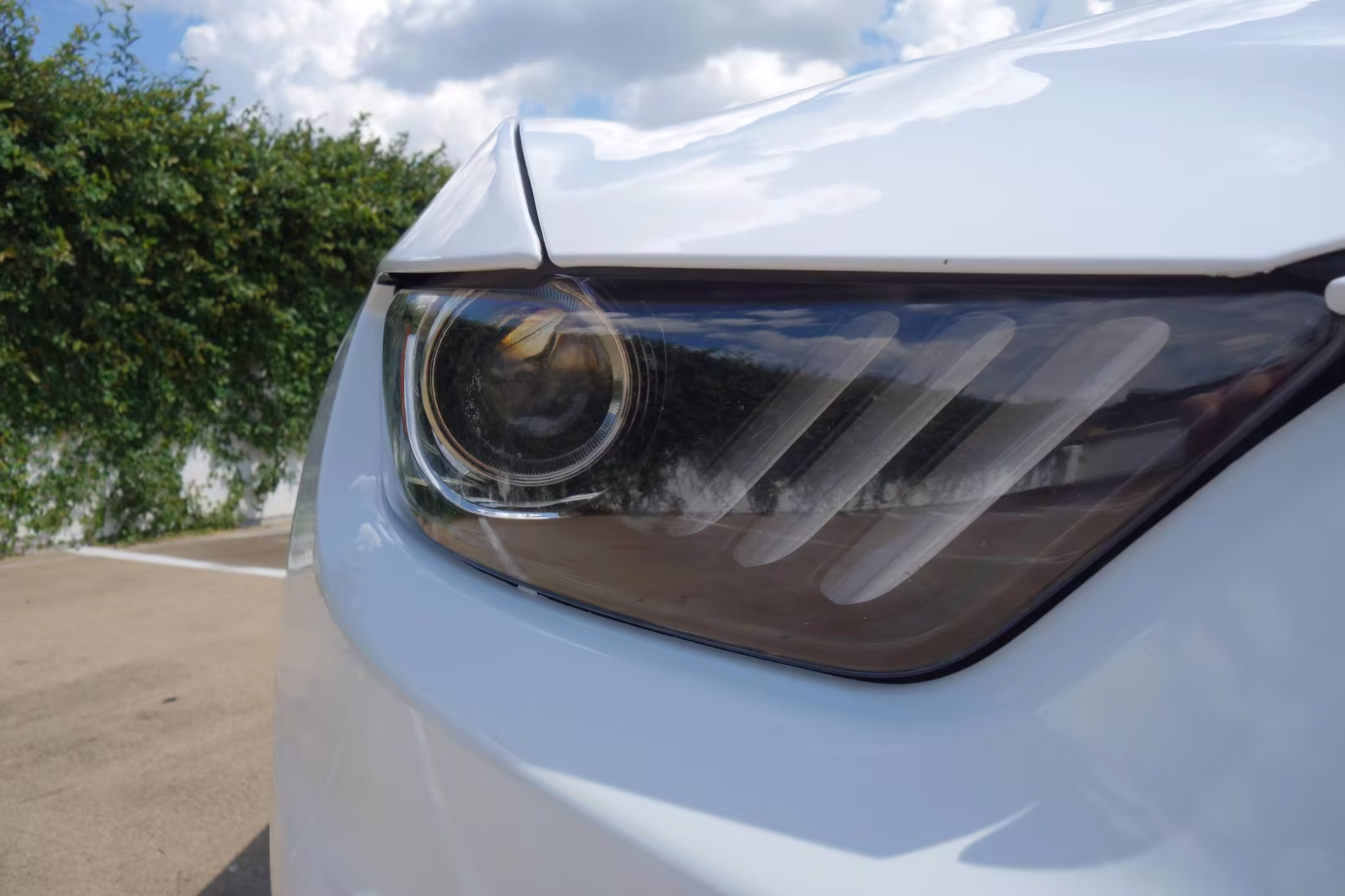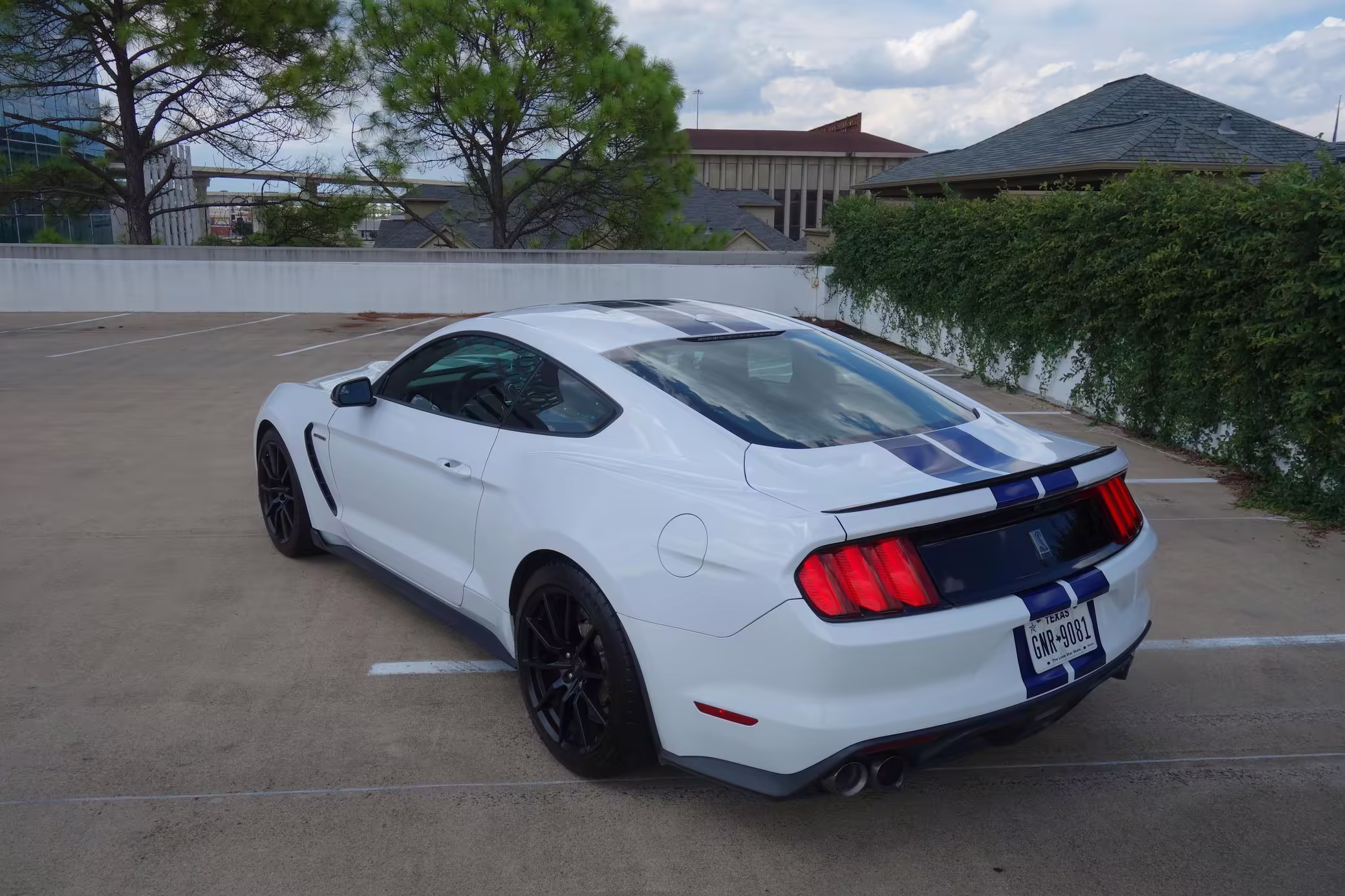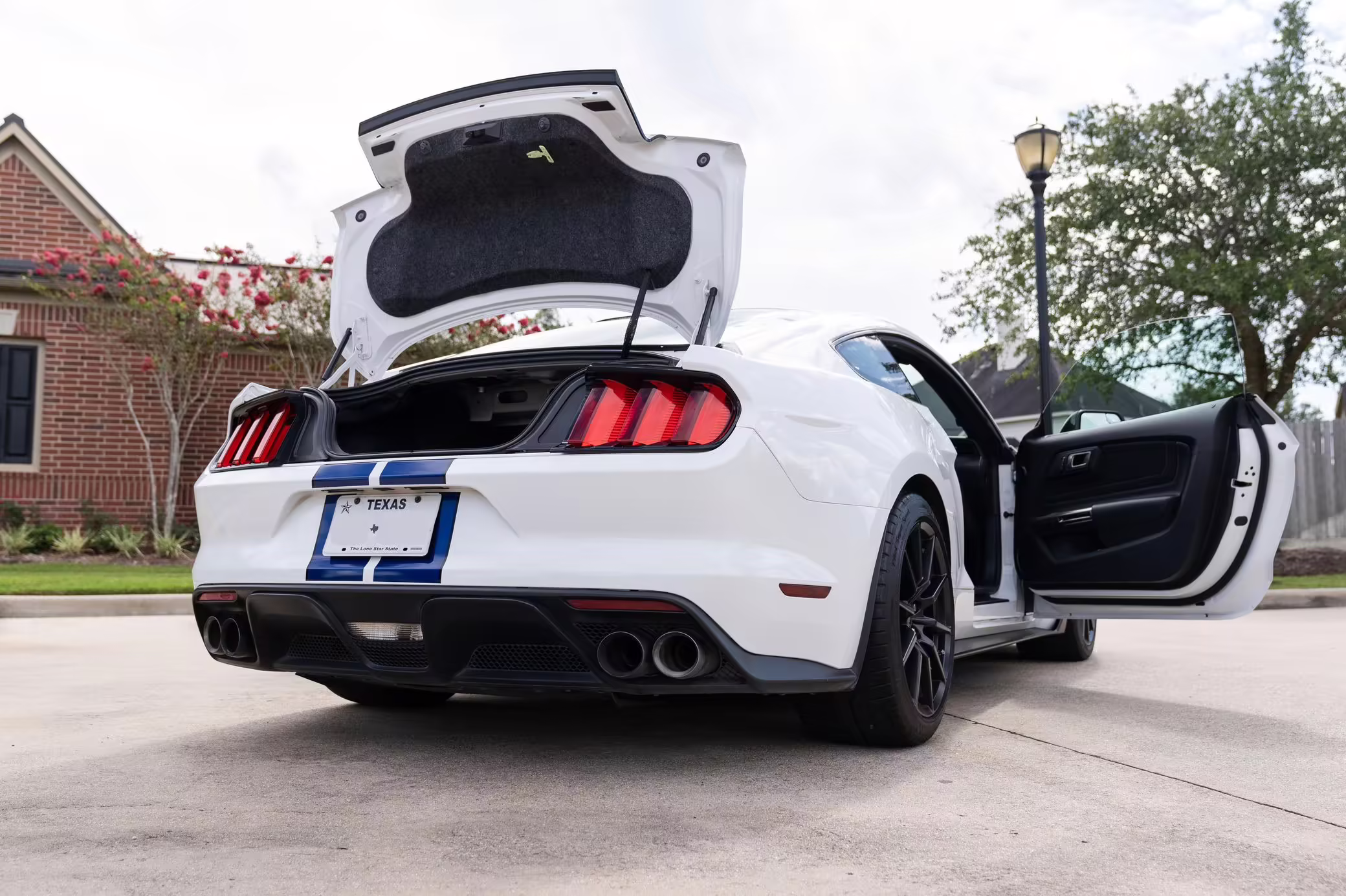 2016 Ford Mustang Shelby GT350, finished in Oxford White with Kona Blue Stripes with a black leather interior.