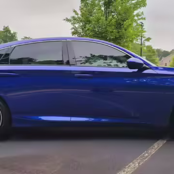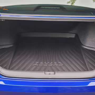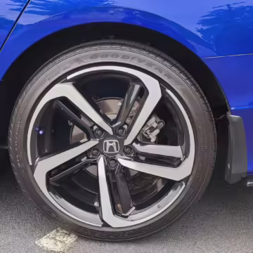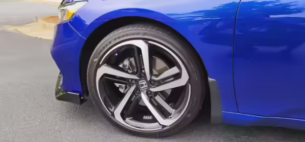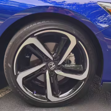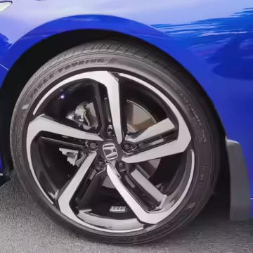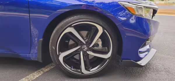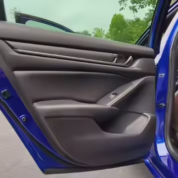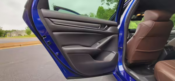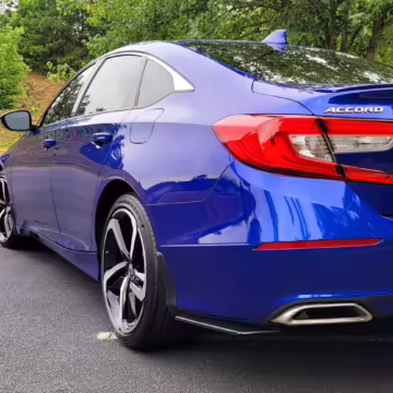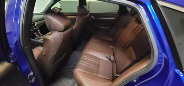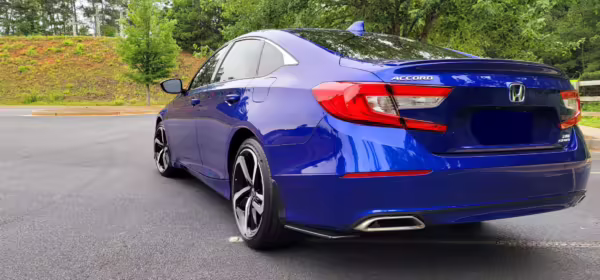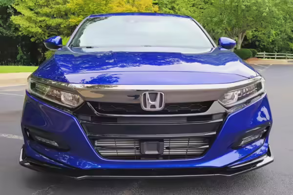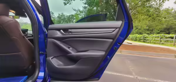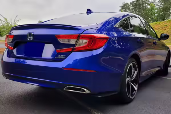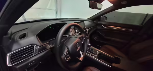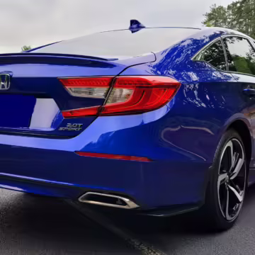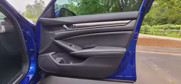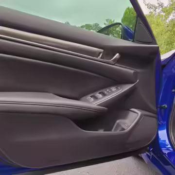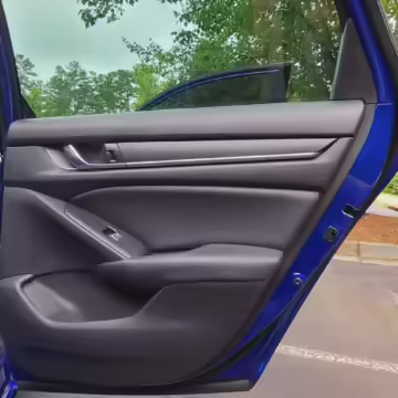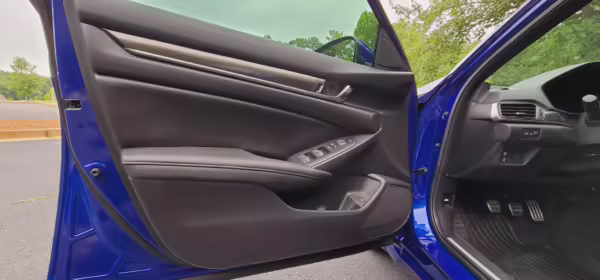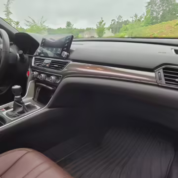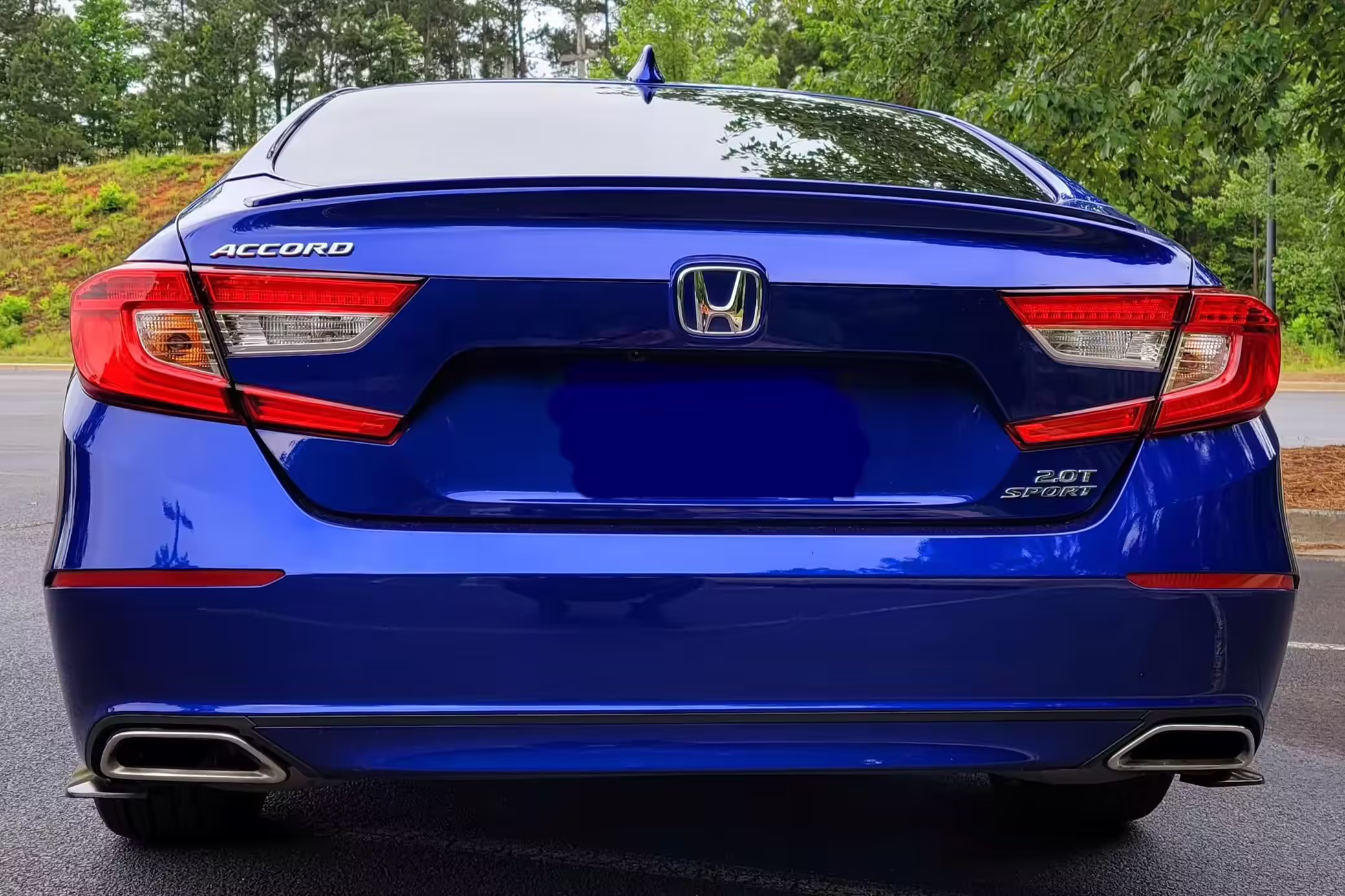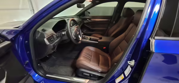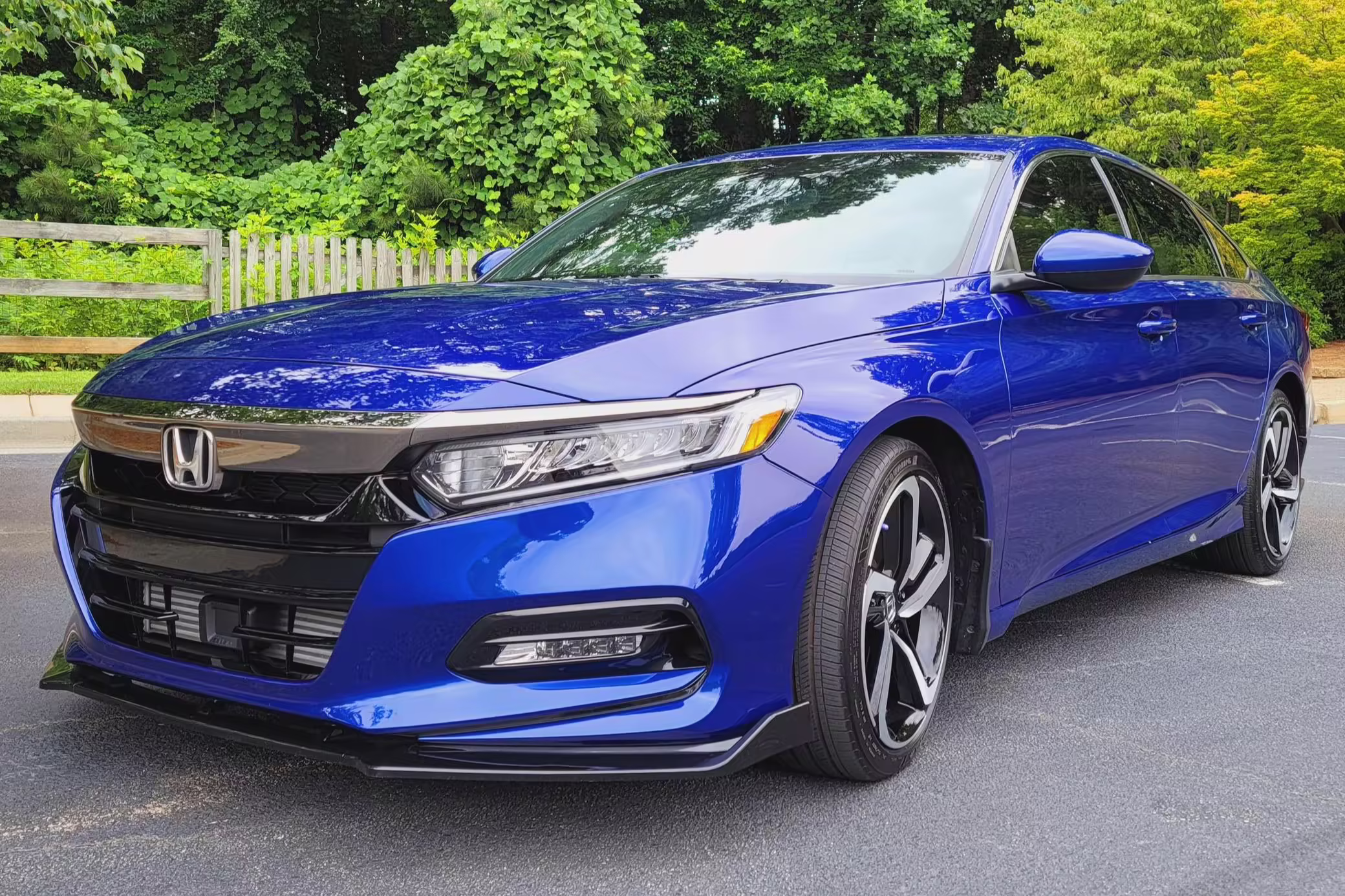This Accord is equipped with 19-inch wheels, a rear spoiler, a sunroof, heated front seats, sport pedals, an 8-speaker sound system, the Honda Sensing suite of electronic driving aids, and hill-start assist technology, according to a window sticker pictured in the gallery.