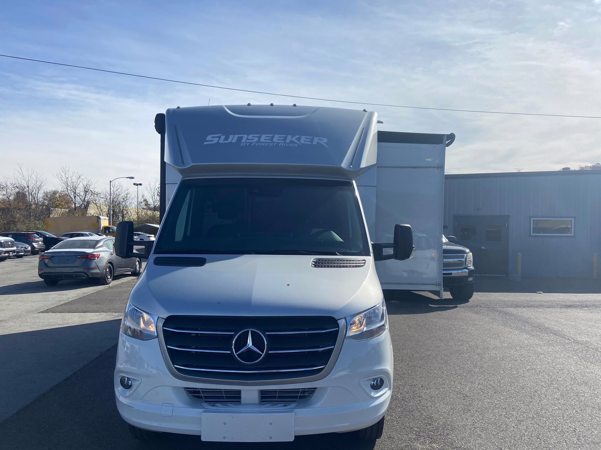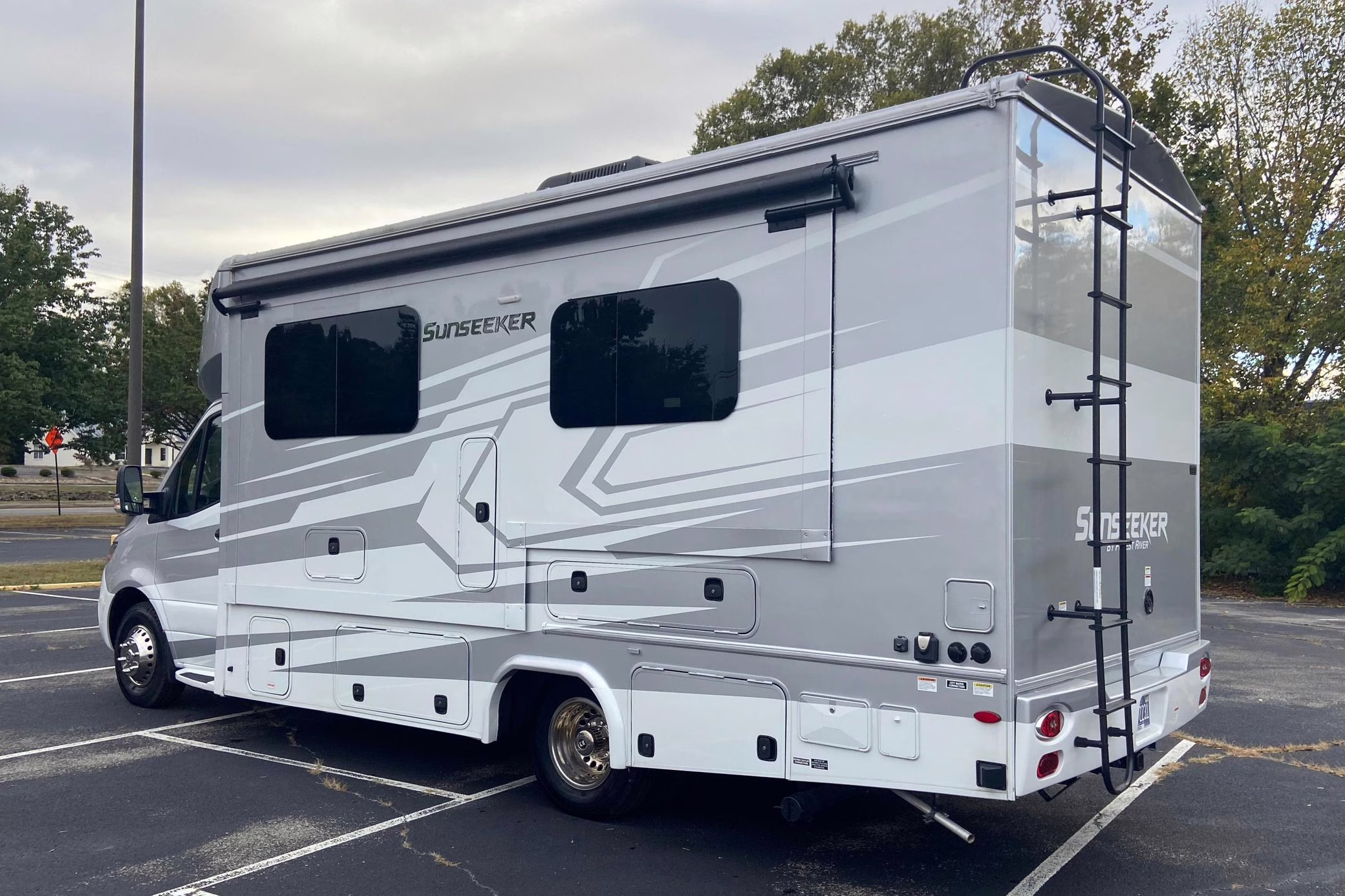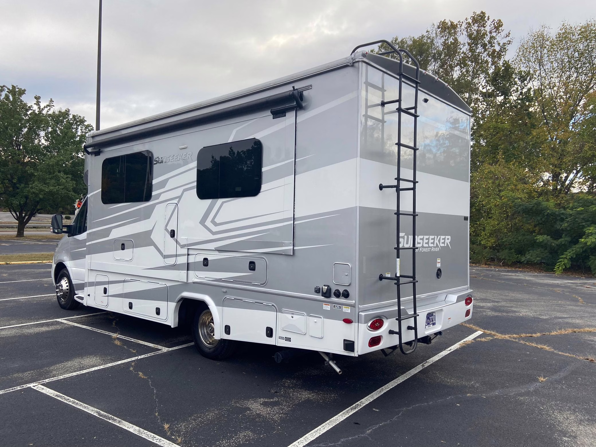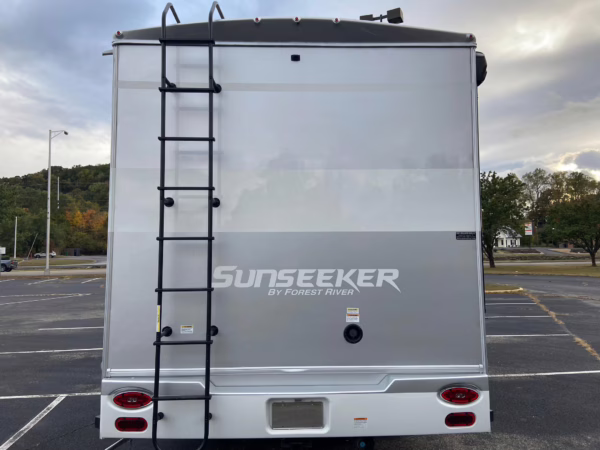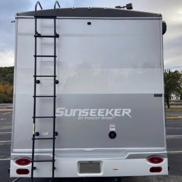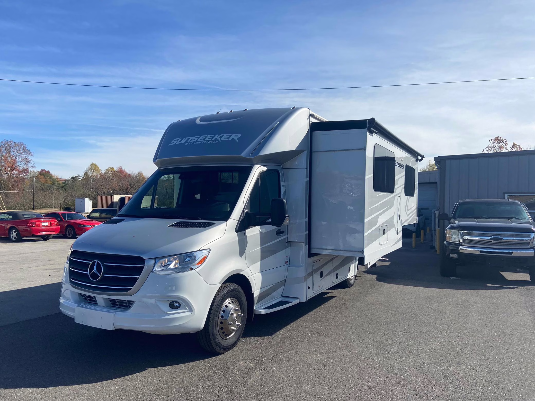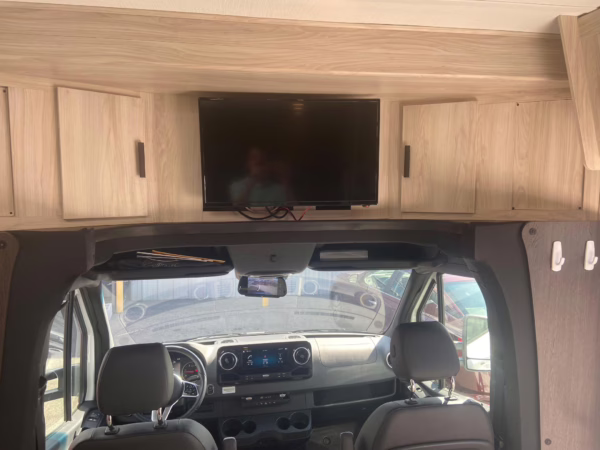 • Built on a 2020 chassis and registered as a 2021 model, this Sprinter was converted into a Class C camper by Indiana-based Forest River. The list of aftermarket parts added during the conversion includes an EQ Systems EQ Smart-Level leveling system, an awning, an external television, a rear-mounted ladder, side-facing reclining theater seats, a queen-size bed, a sink, a Dometic cooktop, a Greystone microwave, a refrigerator and freezer unit, a toilet, a shower, overhead storage compartments, fresh, gray, and black water tanks, a solar panel, and a Cummins Onan QG 3600 LP generator.