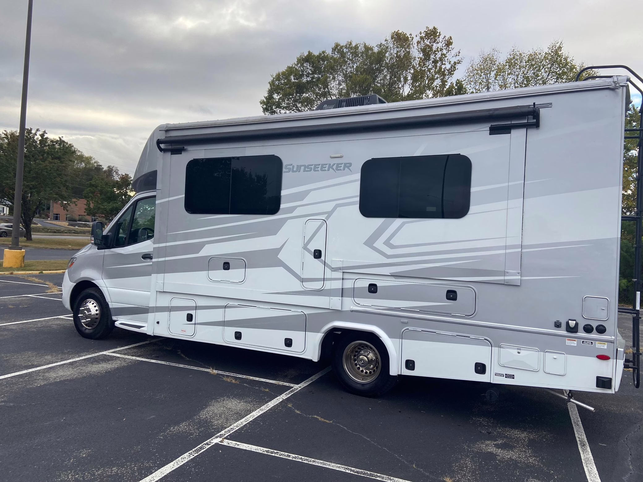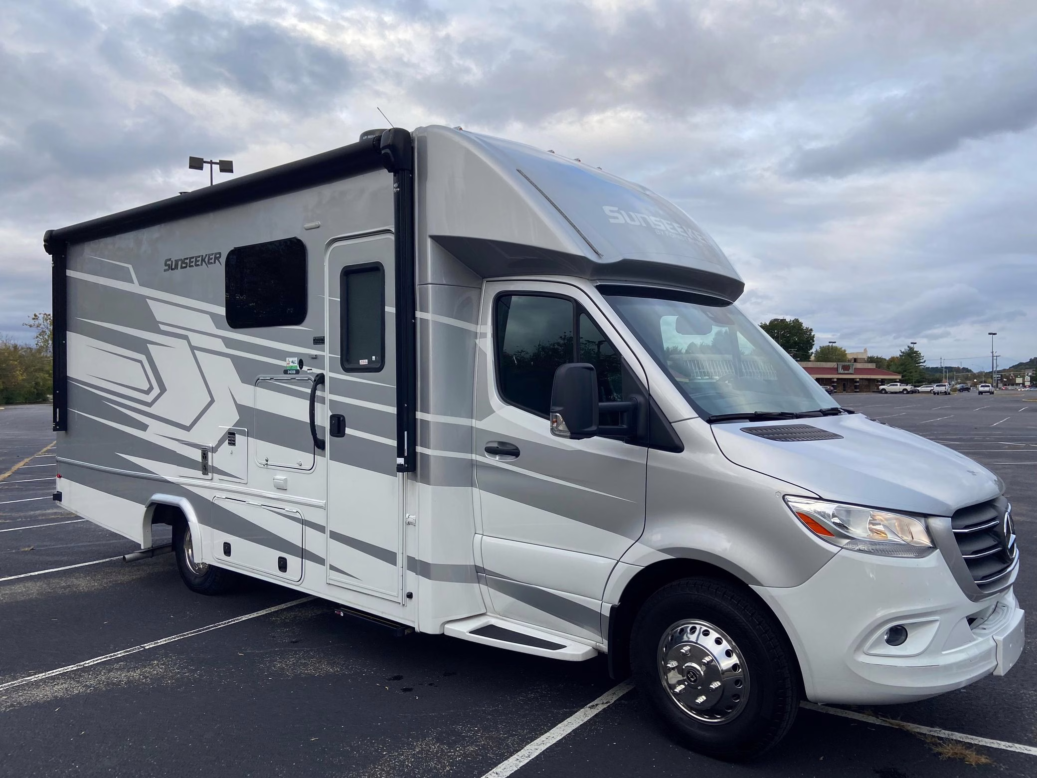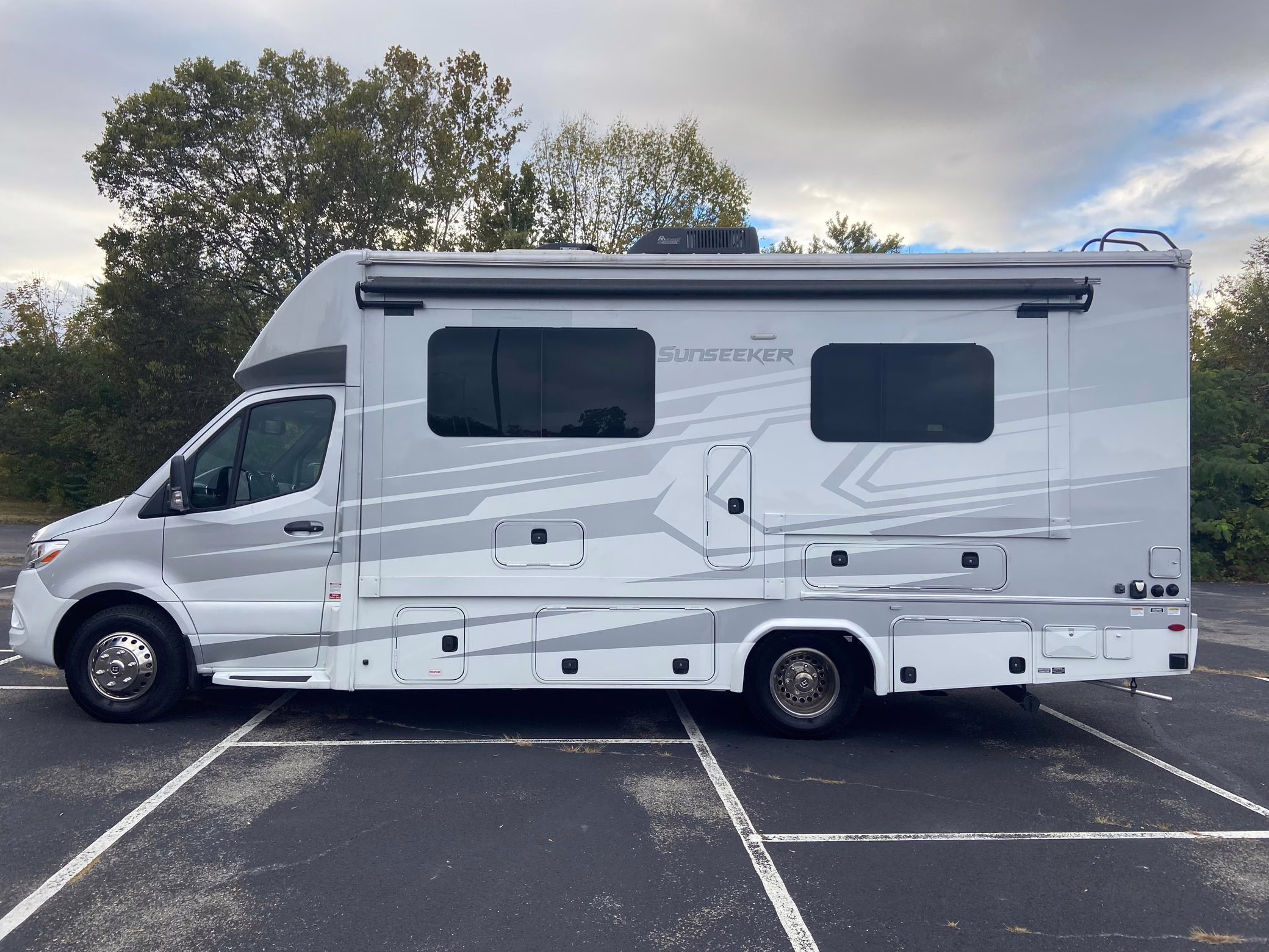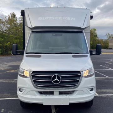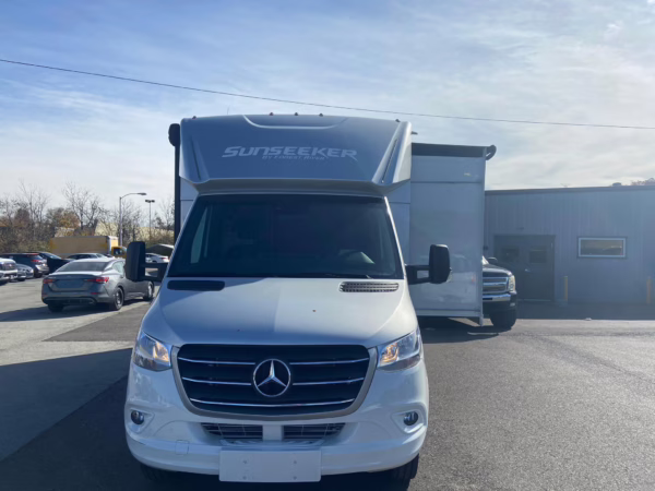 2021 Mercedes-Benz Sprinter 3500XD Sunseeker, finished in white and silver with a black and beige interior.