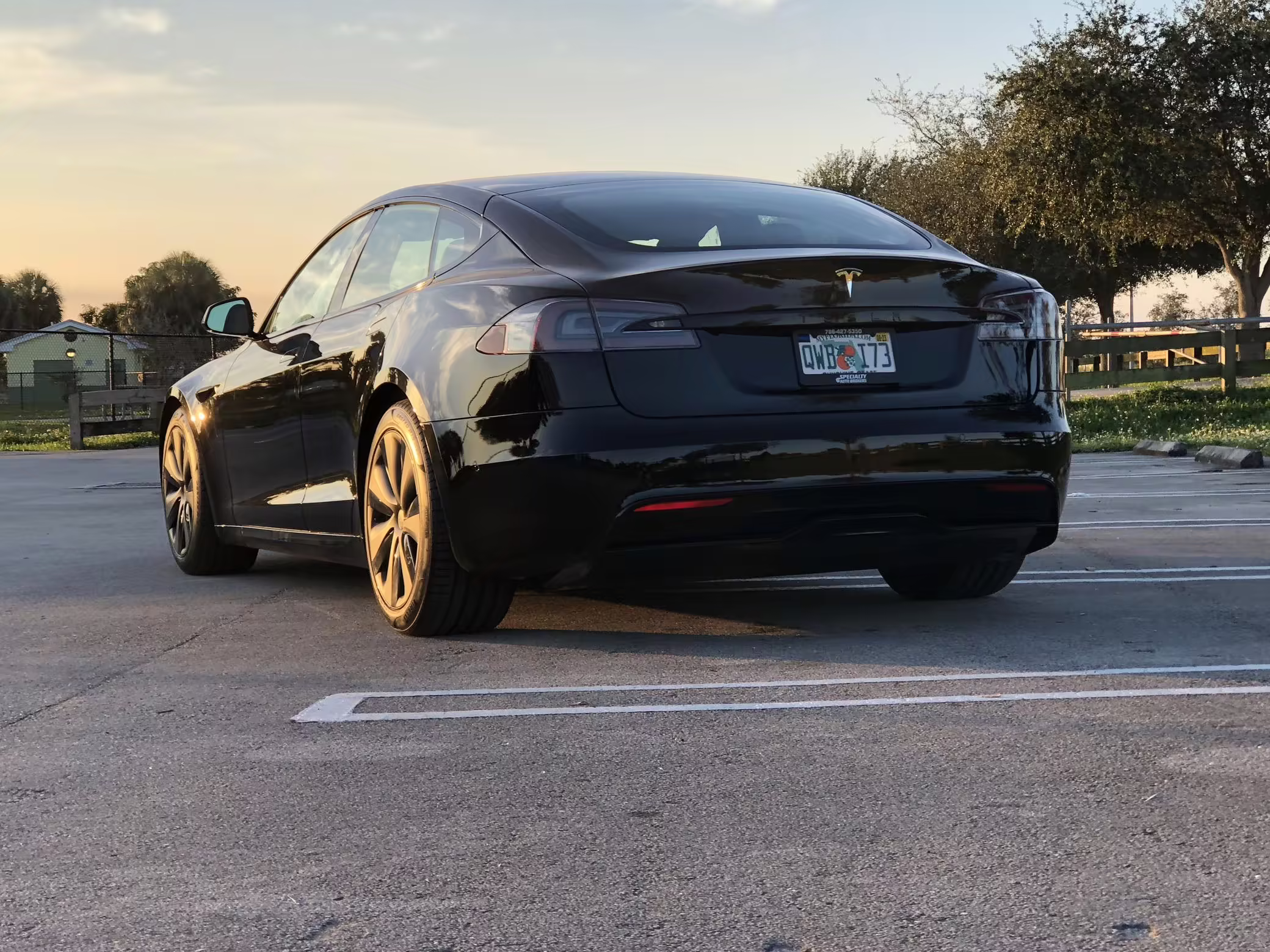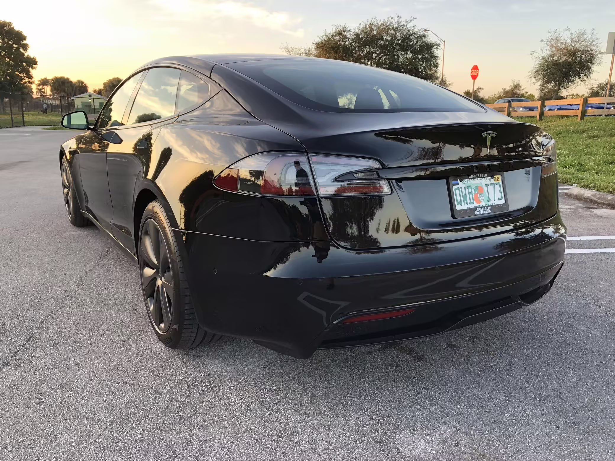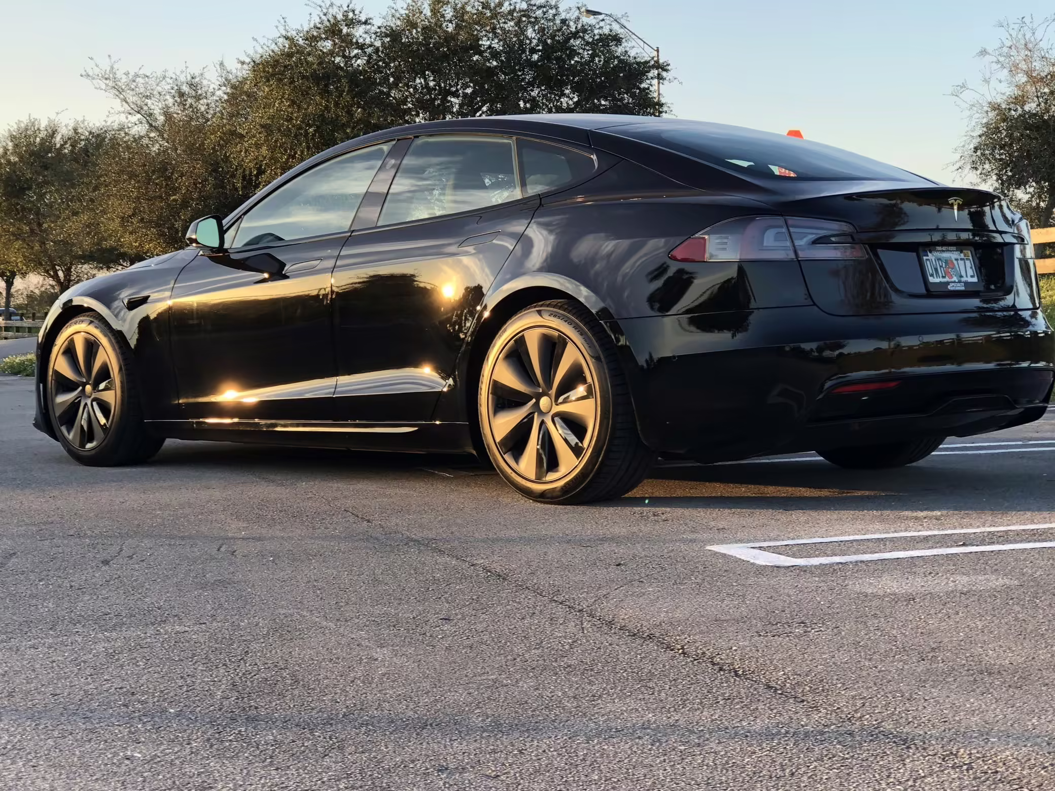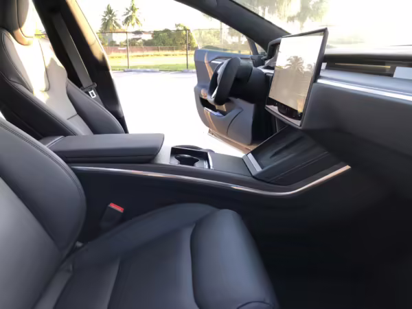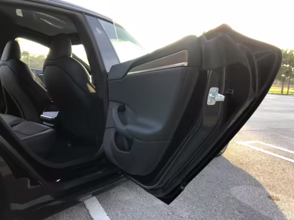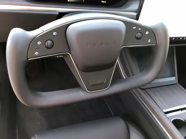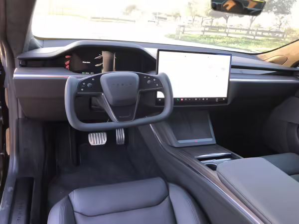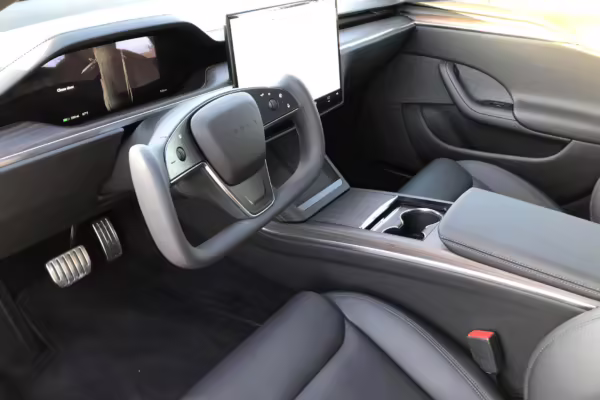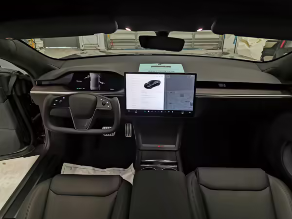 An included window sticker shows this Model S carried a sticker price of $97,690 and came equipped with 19-inch Tempest wheels, adaptive suspension damping, a panoramic glass roof, leatherette upholstery, a yoke steering wheel, heated and cooled front seats, 3-zone climate control system, a 22-speaker audio system, autopilot, and more as detailed below.