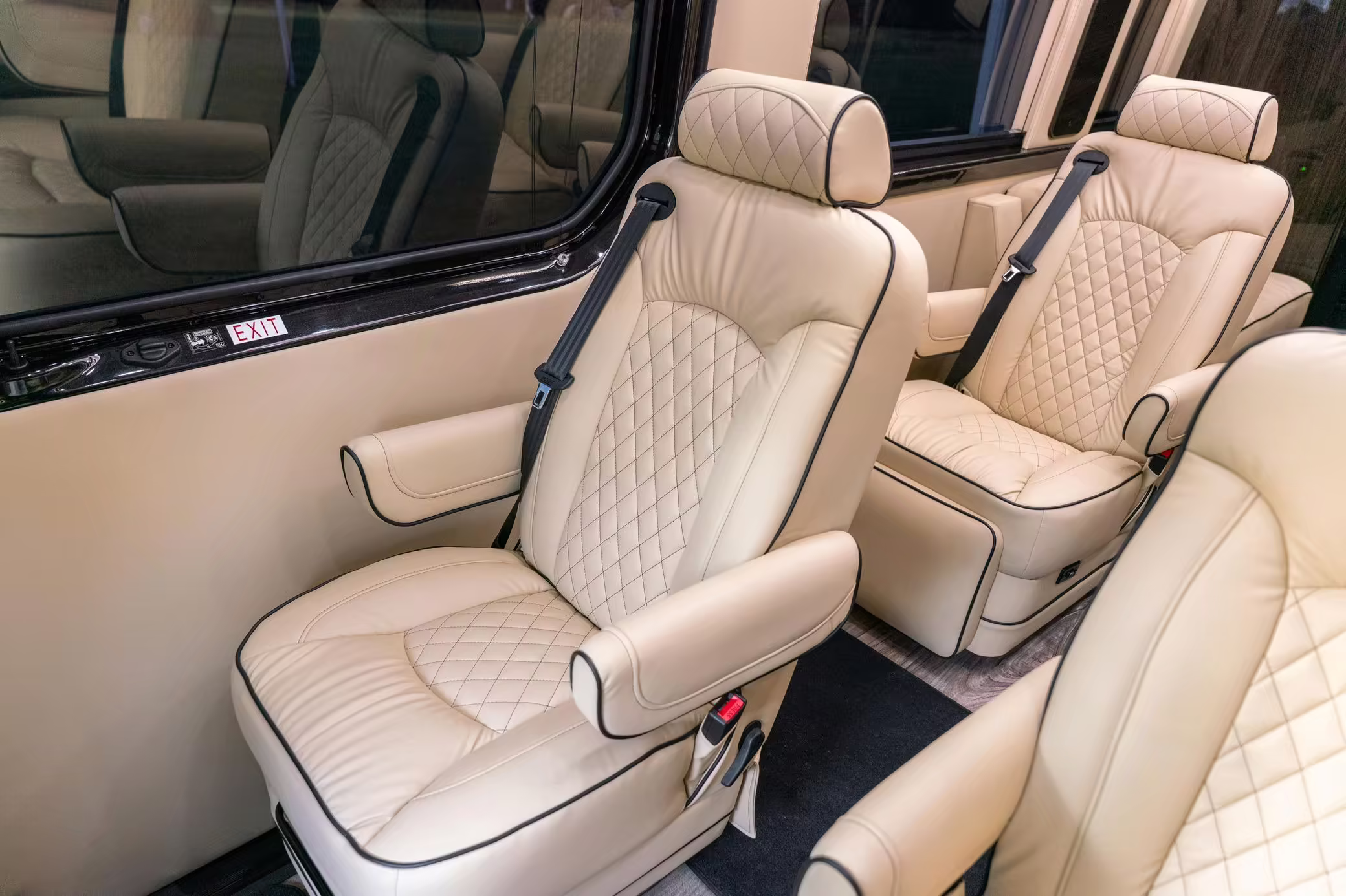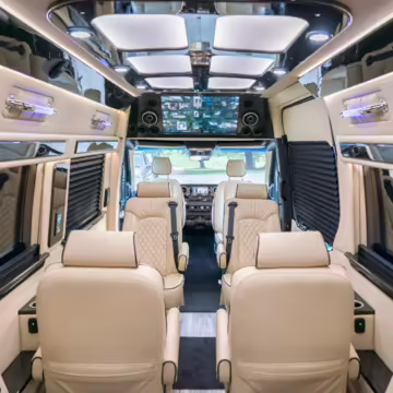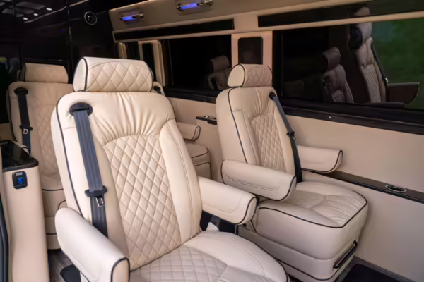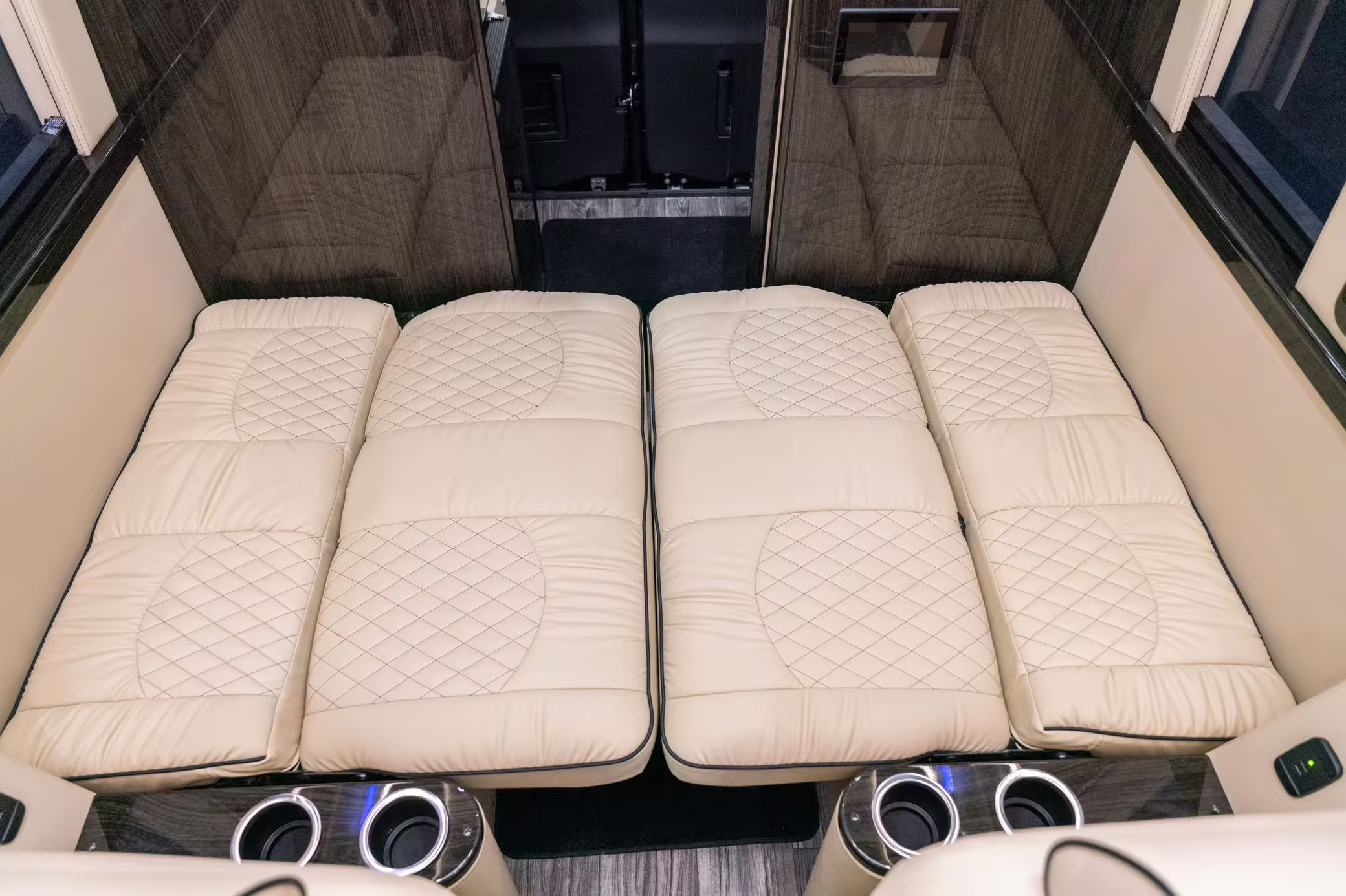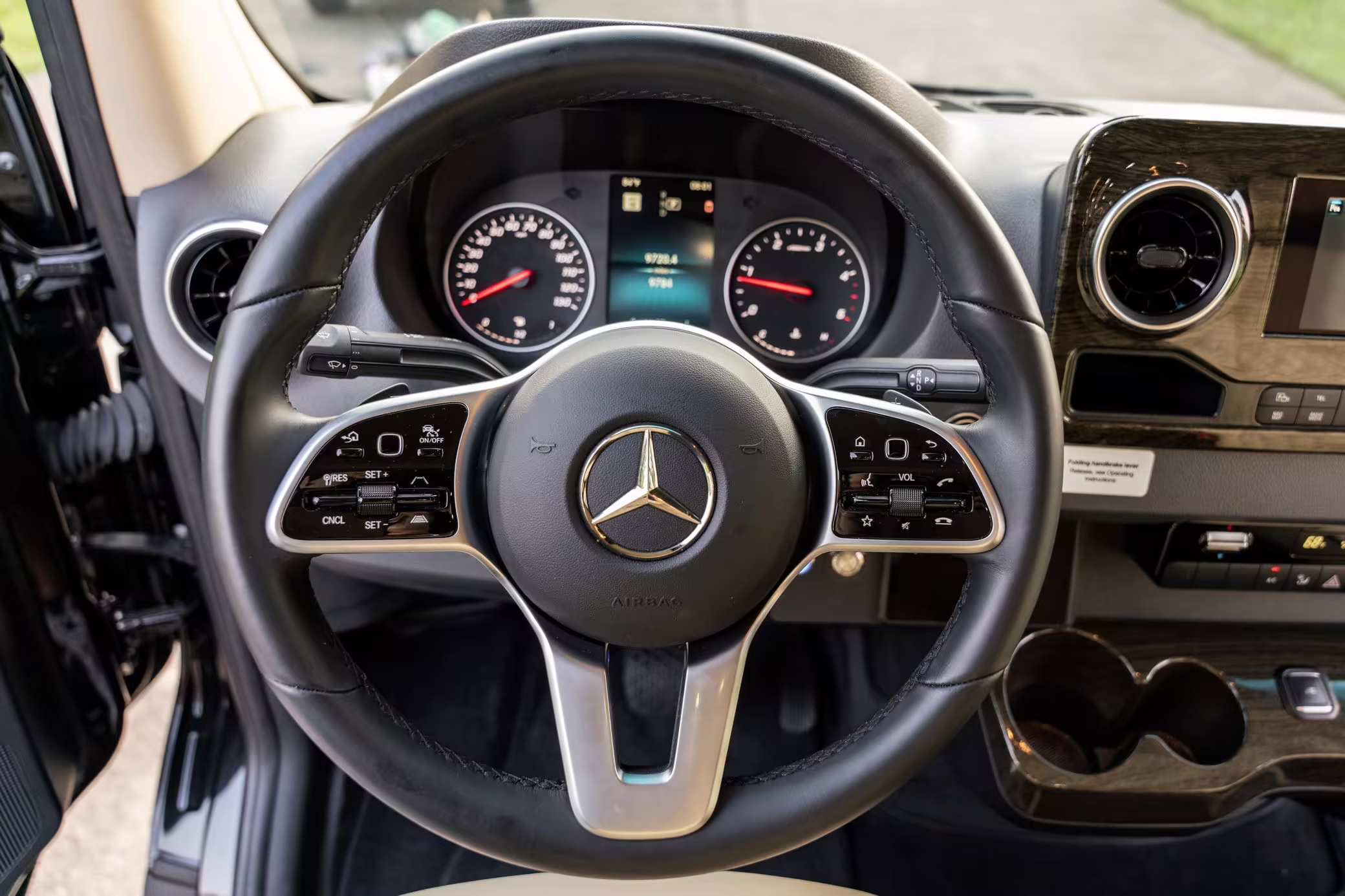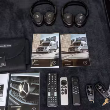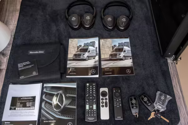 Built on a 2023 chassis, this Sprinter received a luxury van conversion by Ultimate Toys and was designed by Midwest Automotive Design. Notable modifications reported by the seller include adjustable captain’s chairs, a convertible sofa bed, two HDTVs, lap tables, a kitchen, Wi-Fi connectivity, smart controls, and a rear bathroom, among others detailed below.
